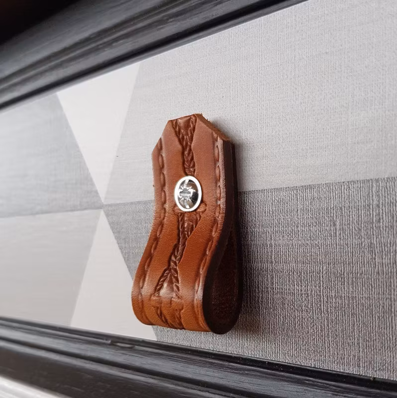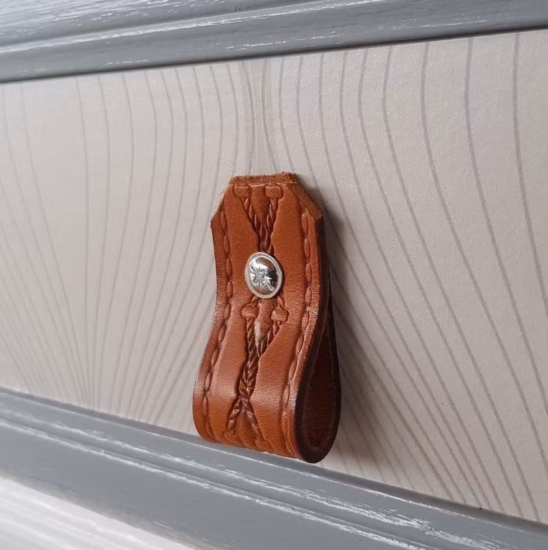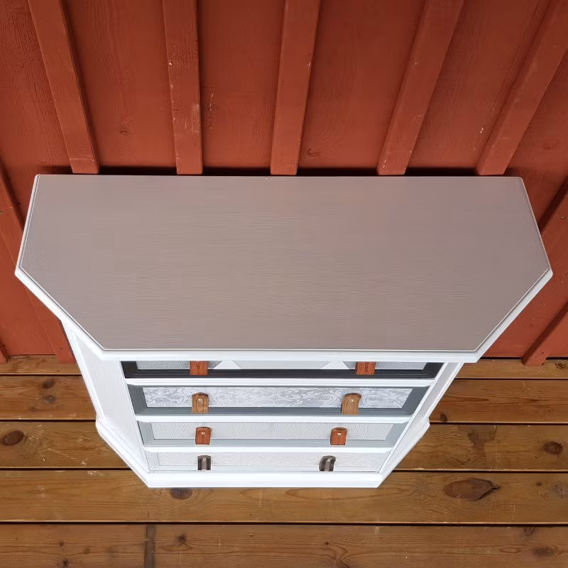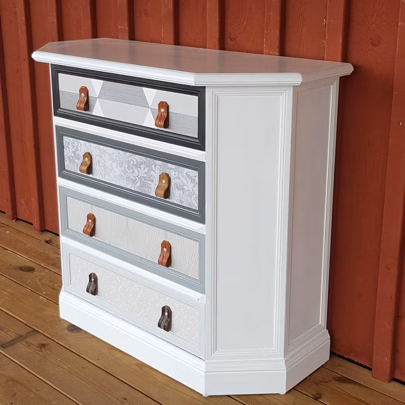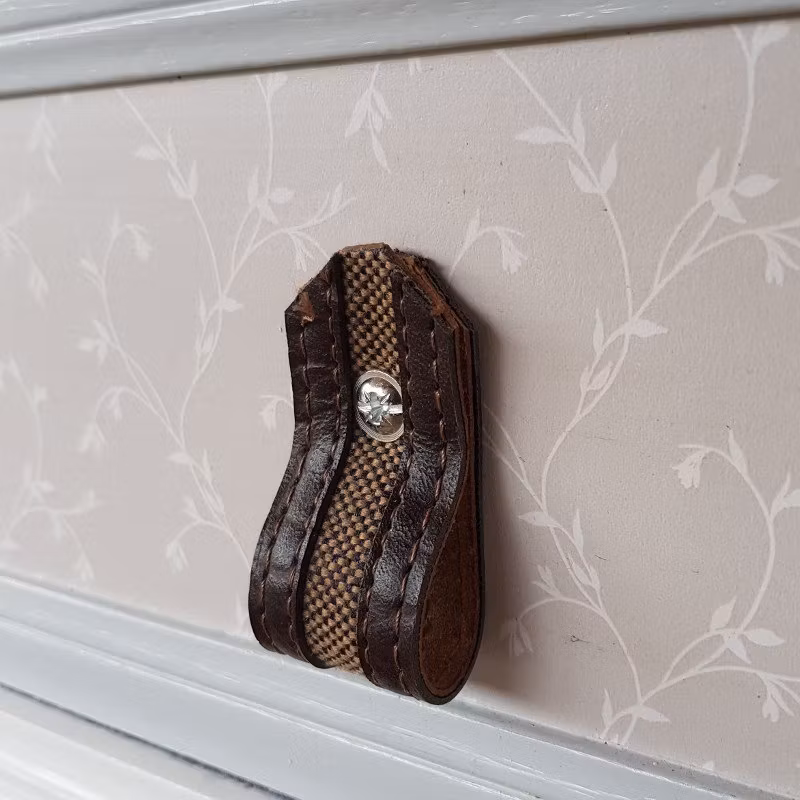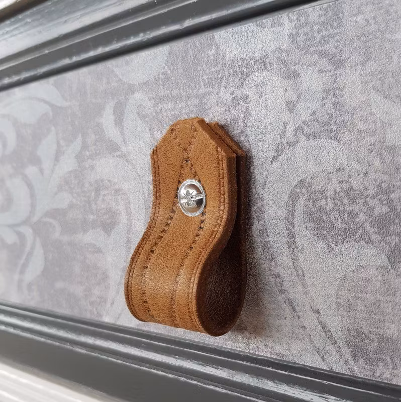 En liten praktisk byrå som fått en ny personlig look i nyanser av grått och med läderbeslag. Stommen är målad i kulören Pebbles av kvalitetsfärg #Autentico Versante Eggshell