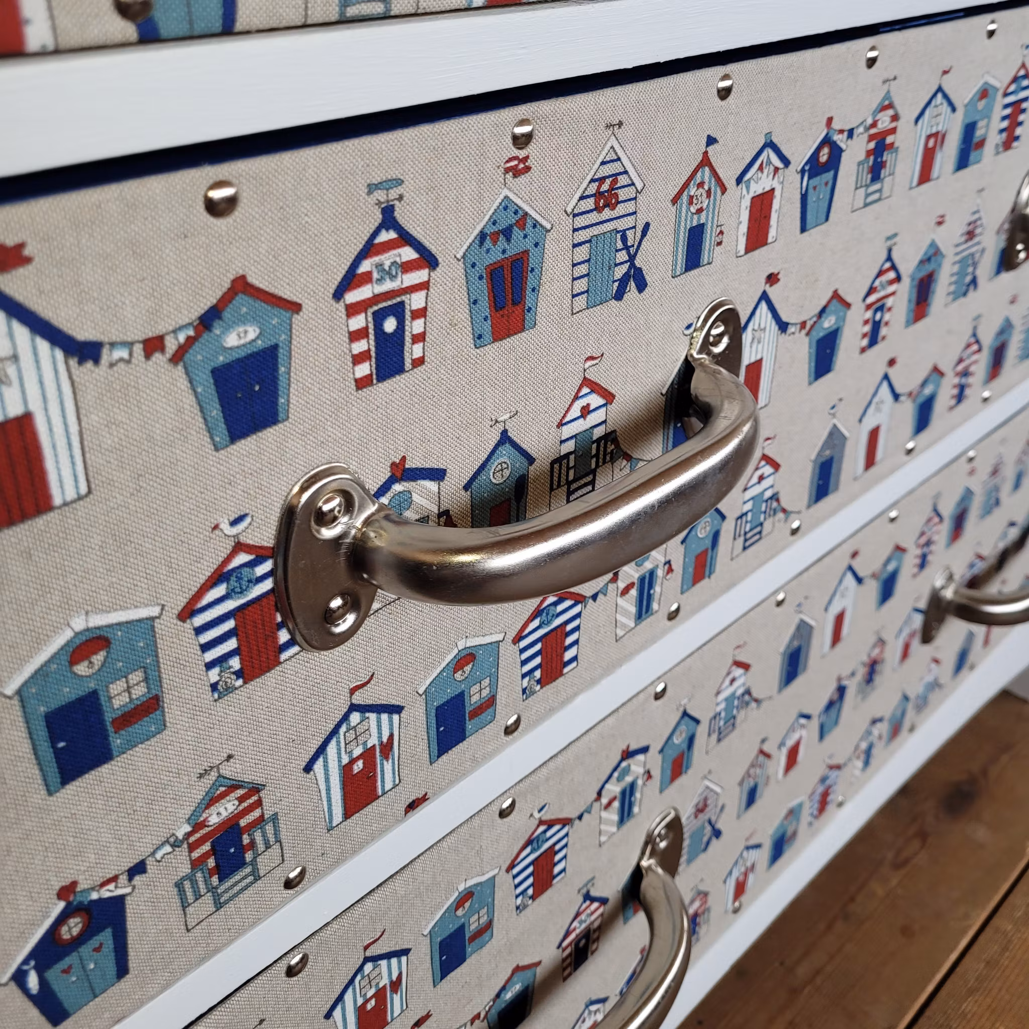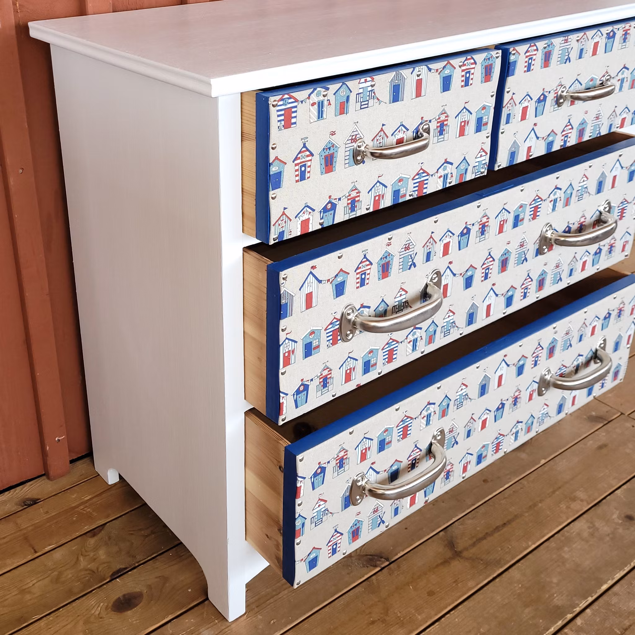 En rejäl byrå som fått en ny personlig och unikt utseende. Lådfronter är klädda i ett läckert och trendsäkert inredningstyg vid namn Nordsjön. Byrån är målad med kritfärg äv märket Autentico Versante Eggshell i kulörerna Pebbles och lådkanter med Nordic Blue. Handtag är återbruk och har viss patina. Byrån har jag köpt hos #ödeshöghjälper .