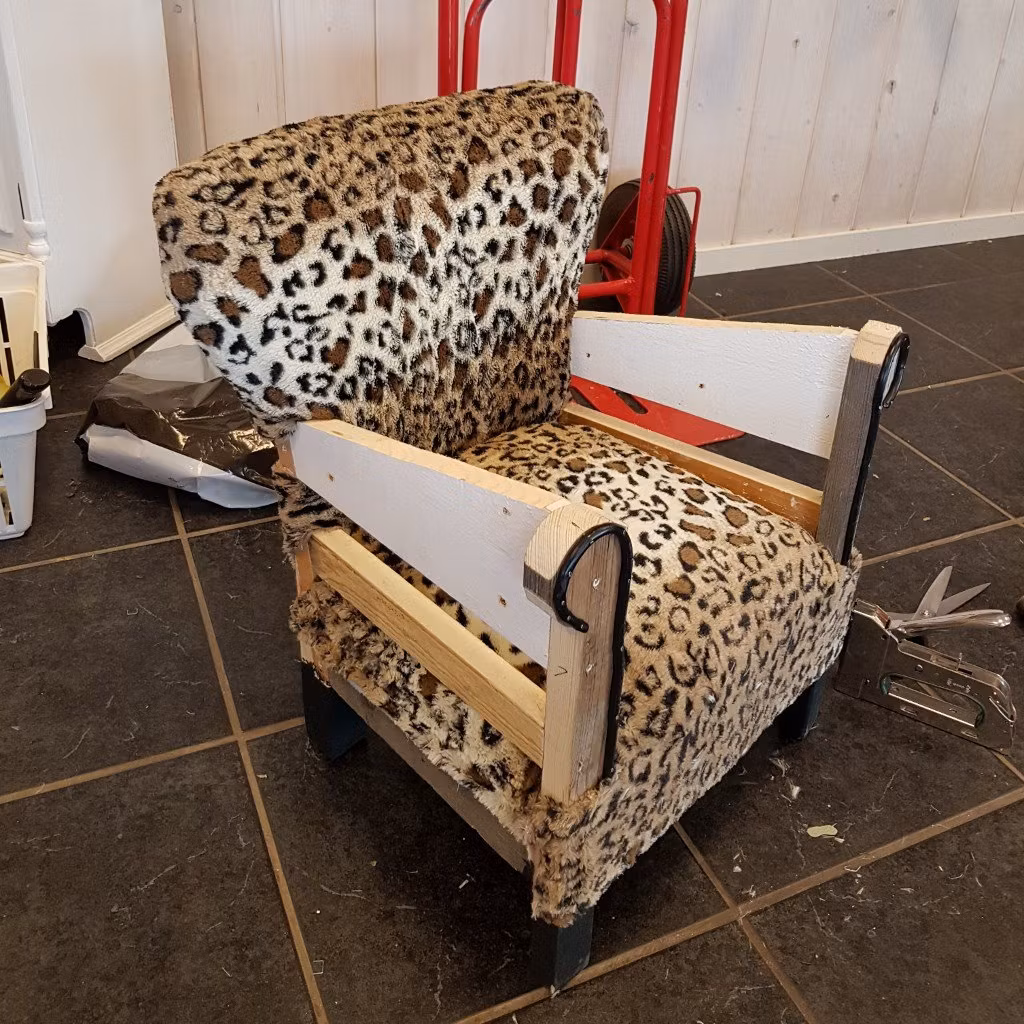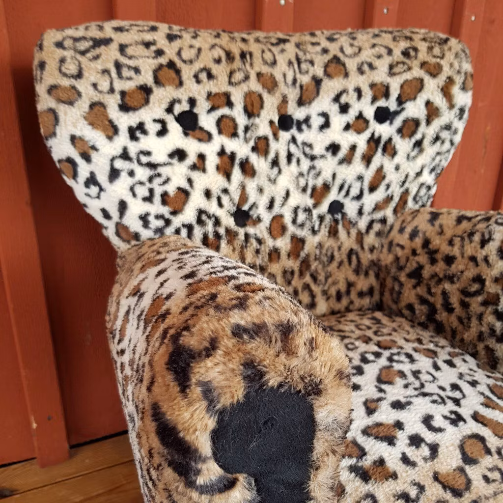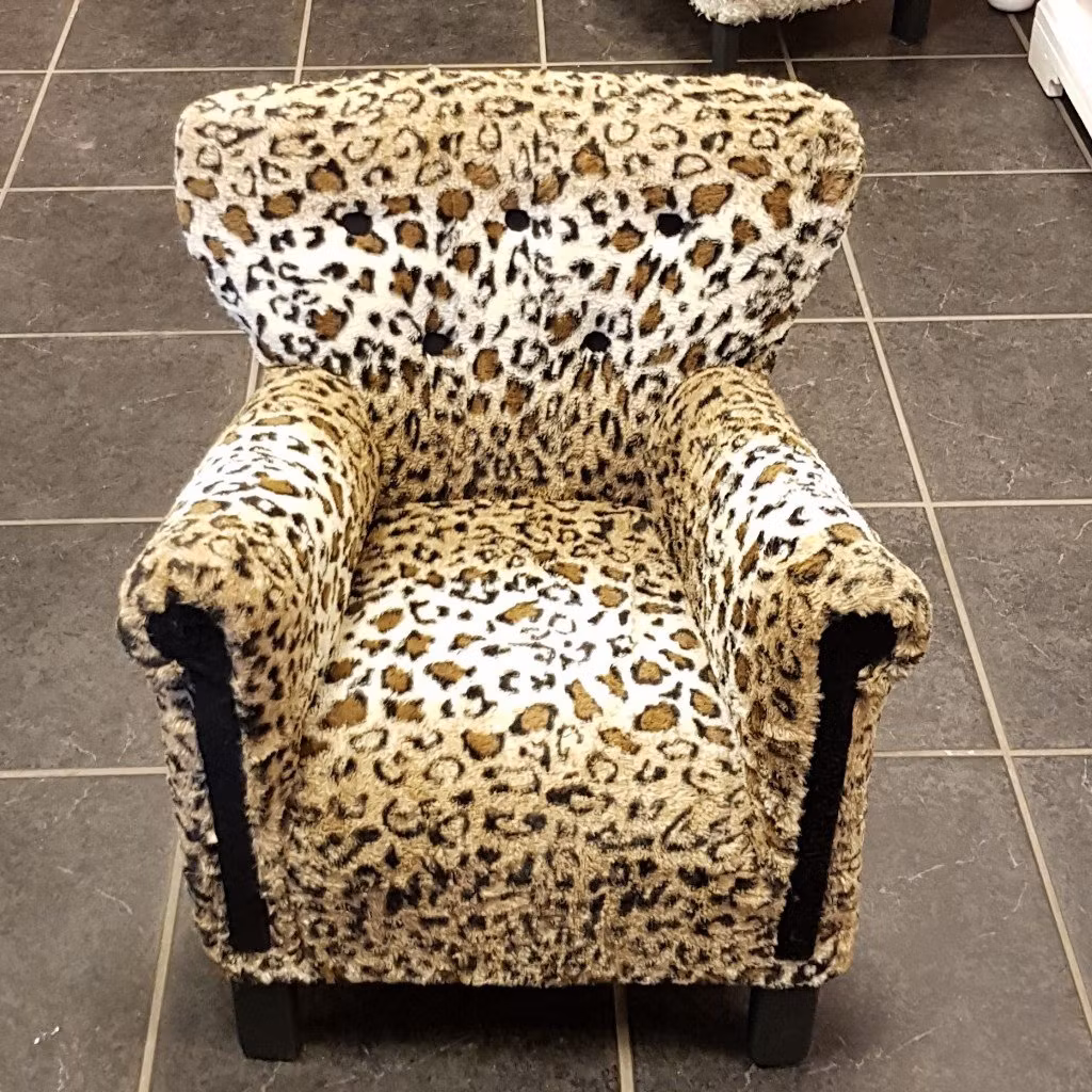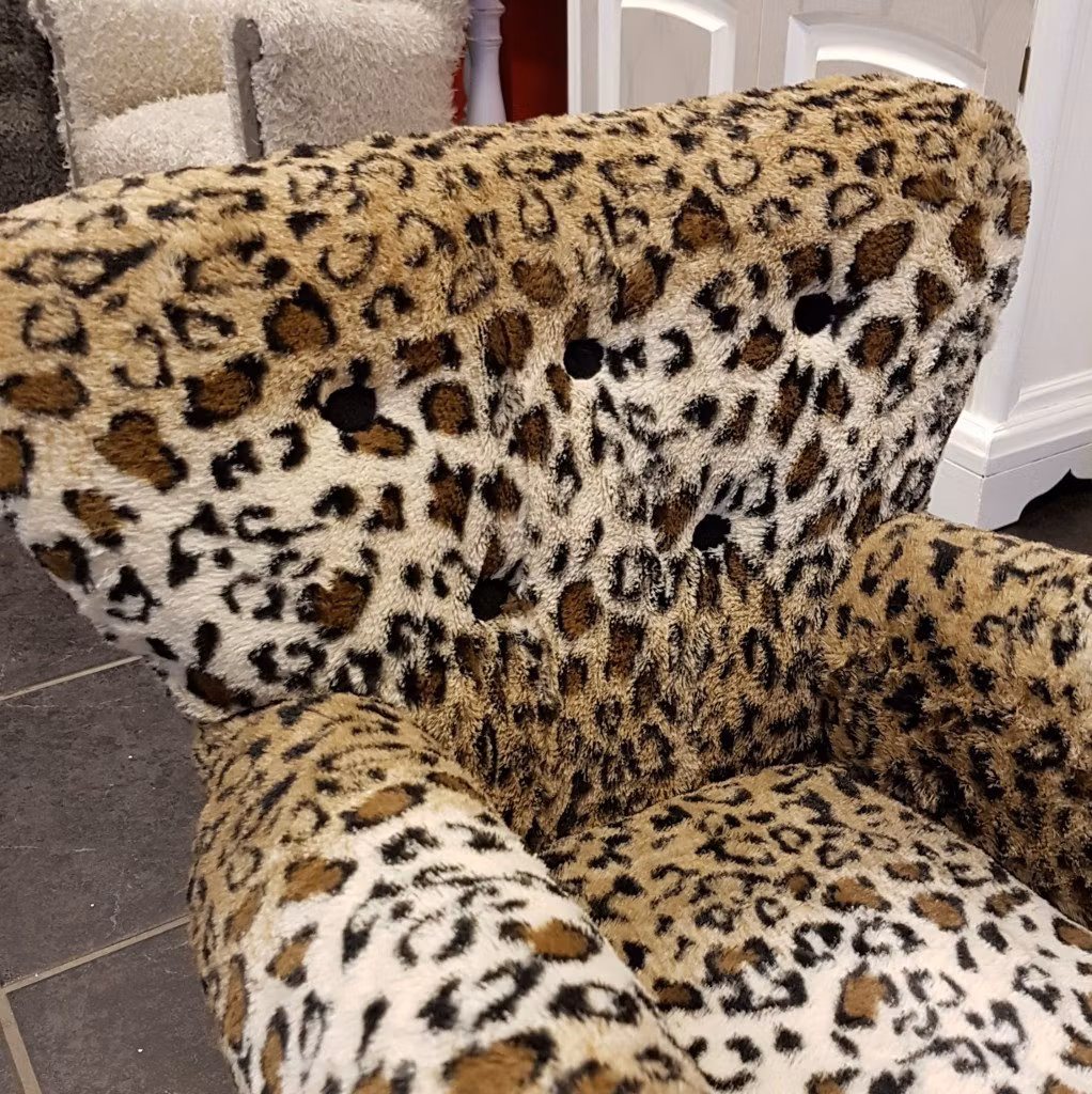 En dekorativ och personligt unik #barnfåtölj som är tillverkad från grunden och klädd i gosigt leopardmönstrat tyg.