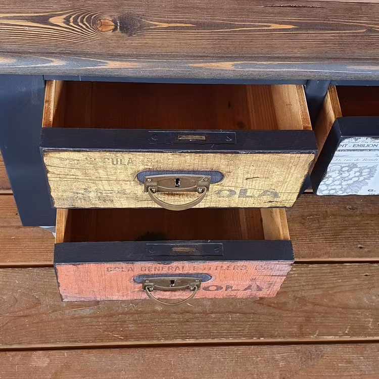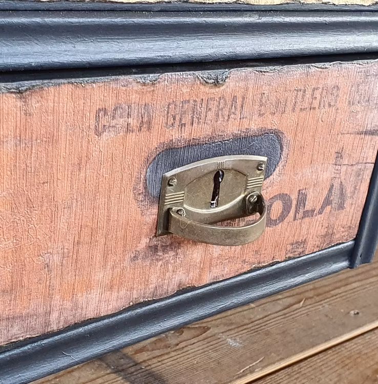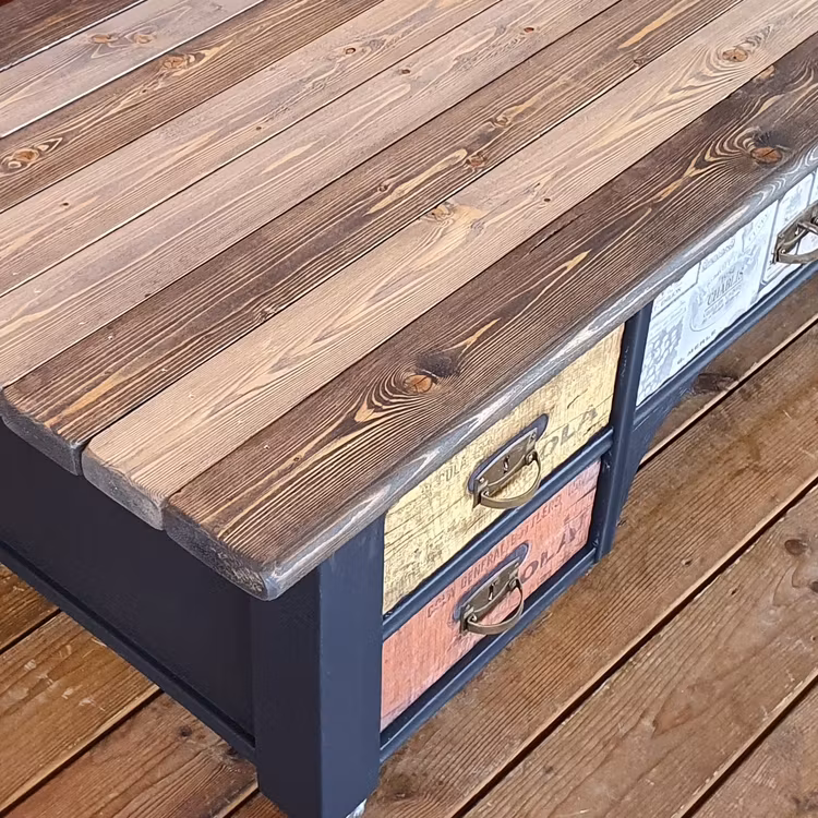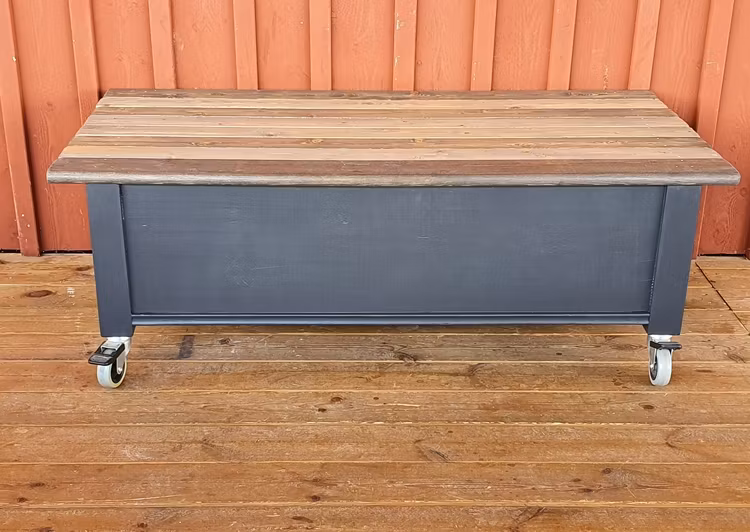 Ett unikt, rustikt och personligt soffbord med smart förvaring. Tillverkat av ett skrivbord där ben kapats och där själva bordet försetts med kraftiga låsbara hjul. Samtliga lådor är låsbara och en nyckel följer.