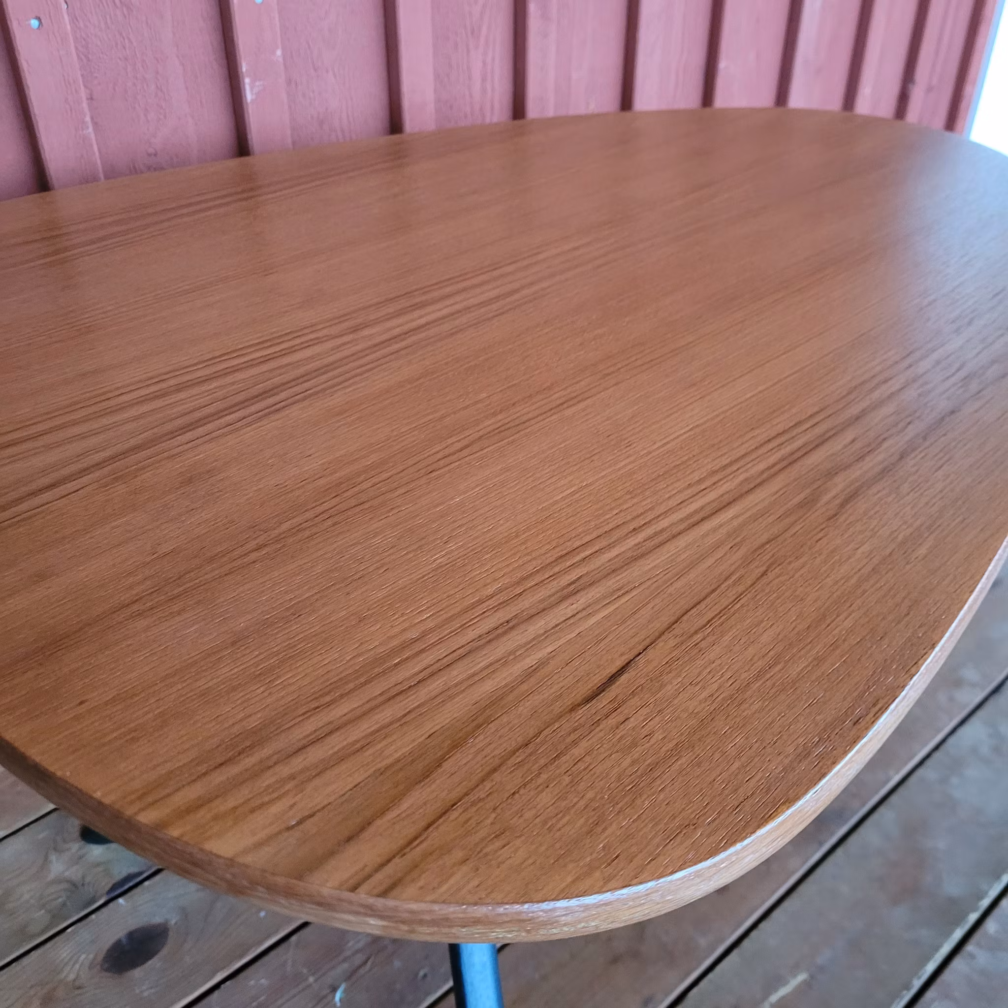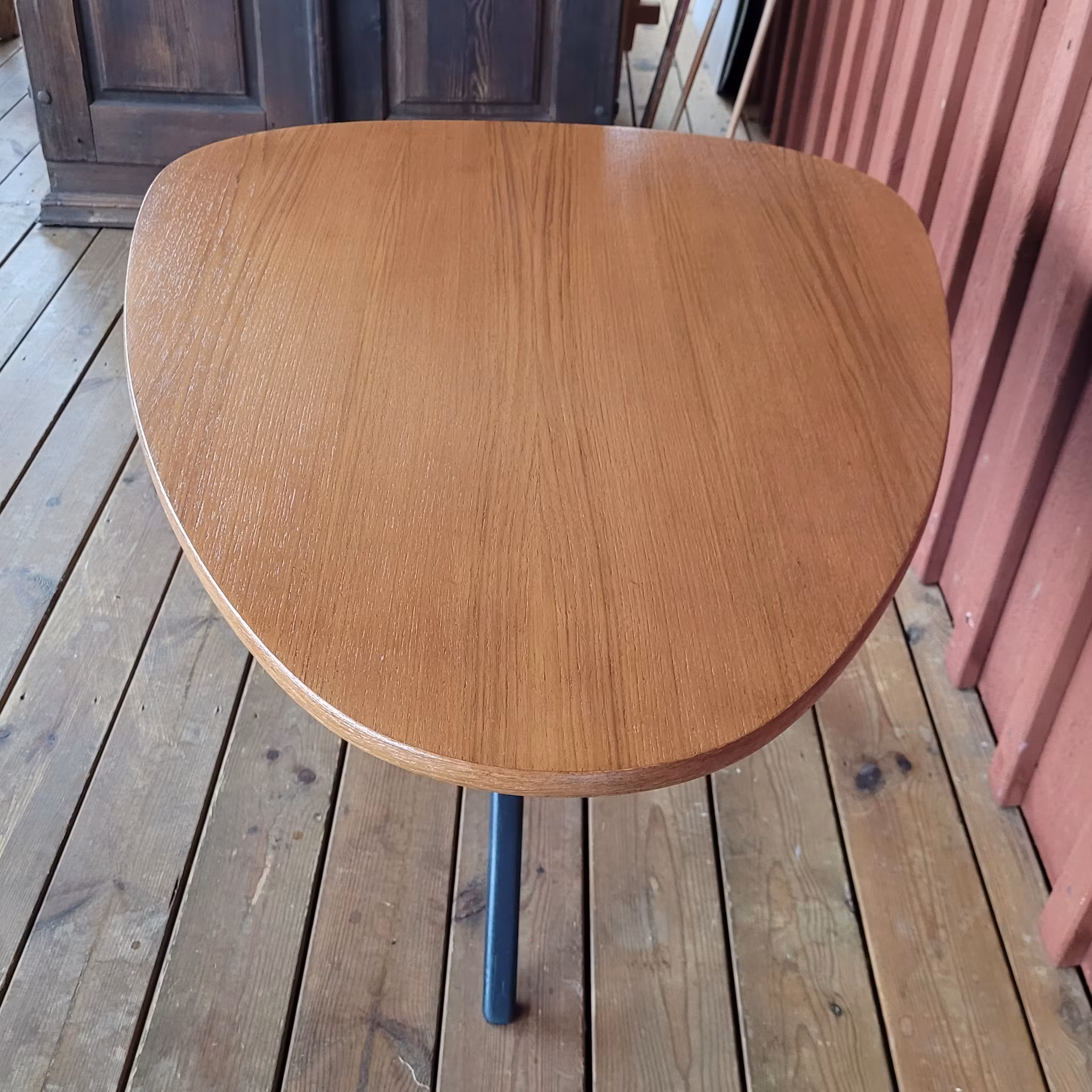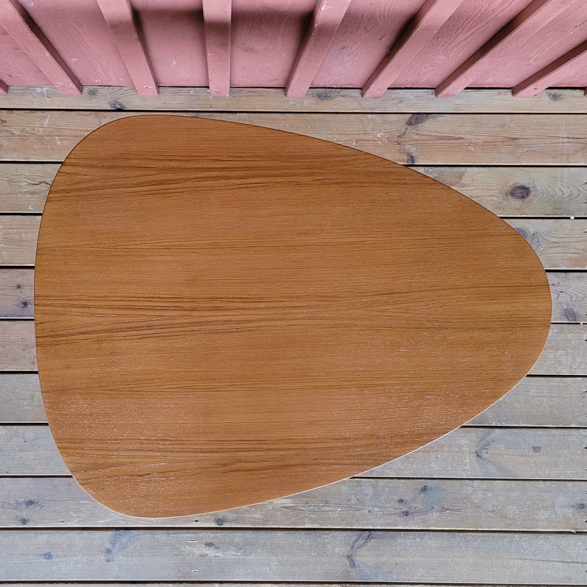 Ett unikt sidobord/soffbord i teak där skivan är äggformad. Skivan är slipad och behandlad med teakbets, betslack och toppad med hårdvaxolja för extra tålighet