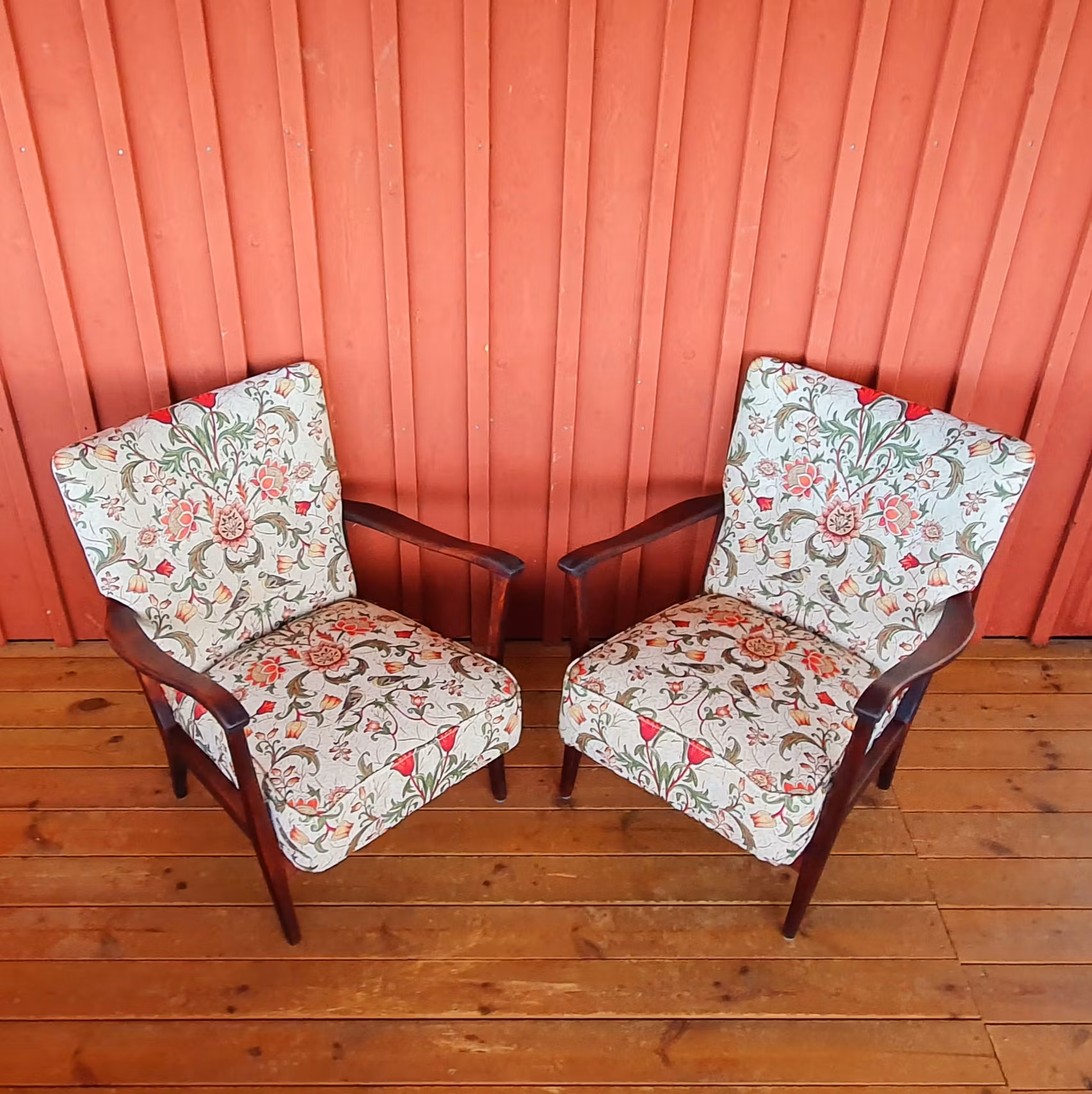 Två urläckra fåtöljer i ett vackert möbeltyg "Gobelin Bird" köpt hos Ohlssons tyger. Trädetaljer är slipade, betsade i kulören teak och slutbehandlade med ett par lager Autentico hårdvaxolja natural. Sits och rygg har passboalsöm och knappar är tillverkade från restmaterial av samma tyg.