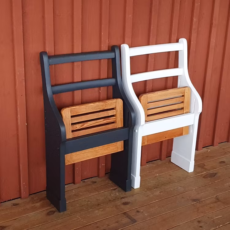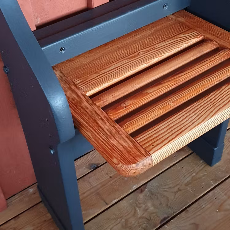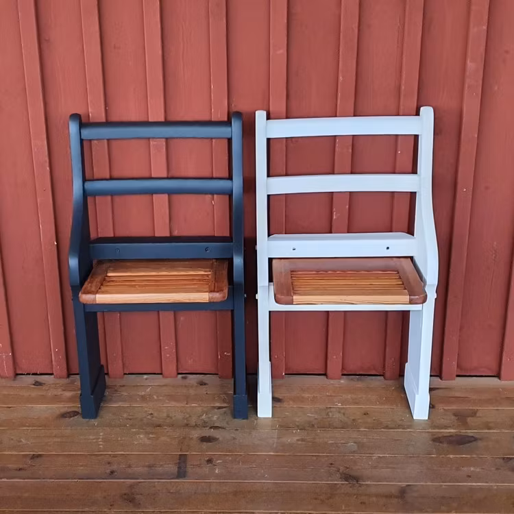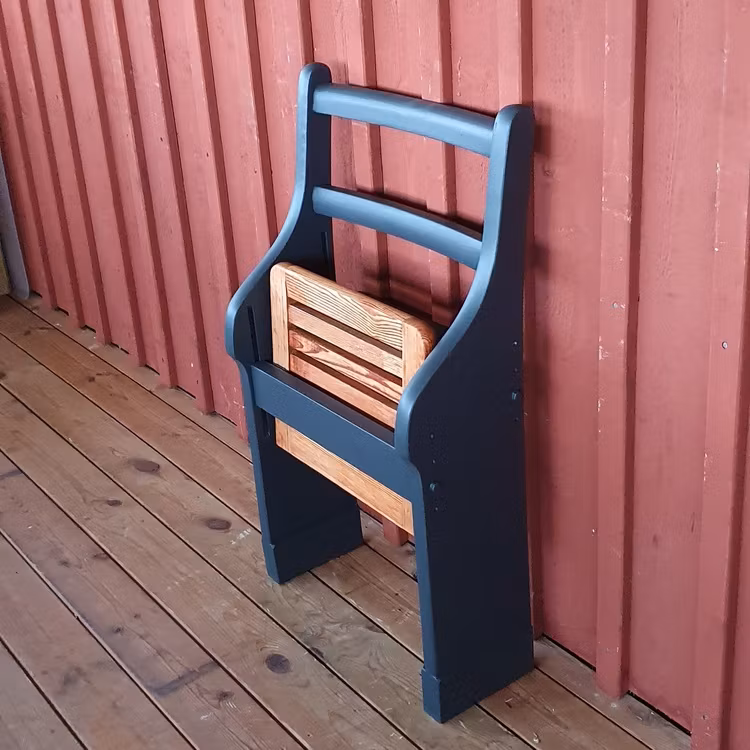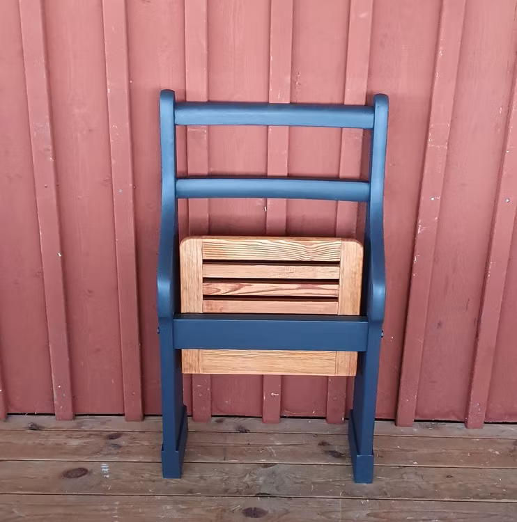 En praktisk och originell klappstolar som lämpar sig för den lilla hallen har tagit form. Perfekta vid skopåsättning. Den är målade i färgsorten Autentico Versante Matt i den mattsvarta kulörerna Graphite och själva sitsen är slipad och behandlade med hårdvaxolja clear. Möbeln kommer ursprungligen från en skolbänk som i lärande syfte fyllt sin funktion i byskolan i Kanikenäs vid Visjön i sydvästra Östergötland