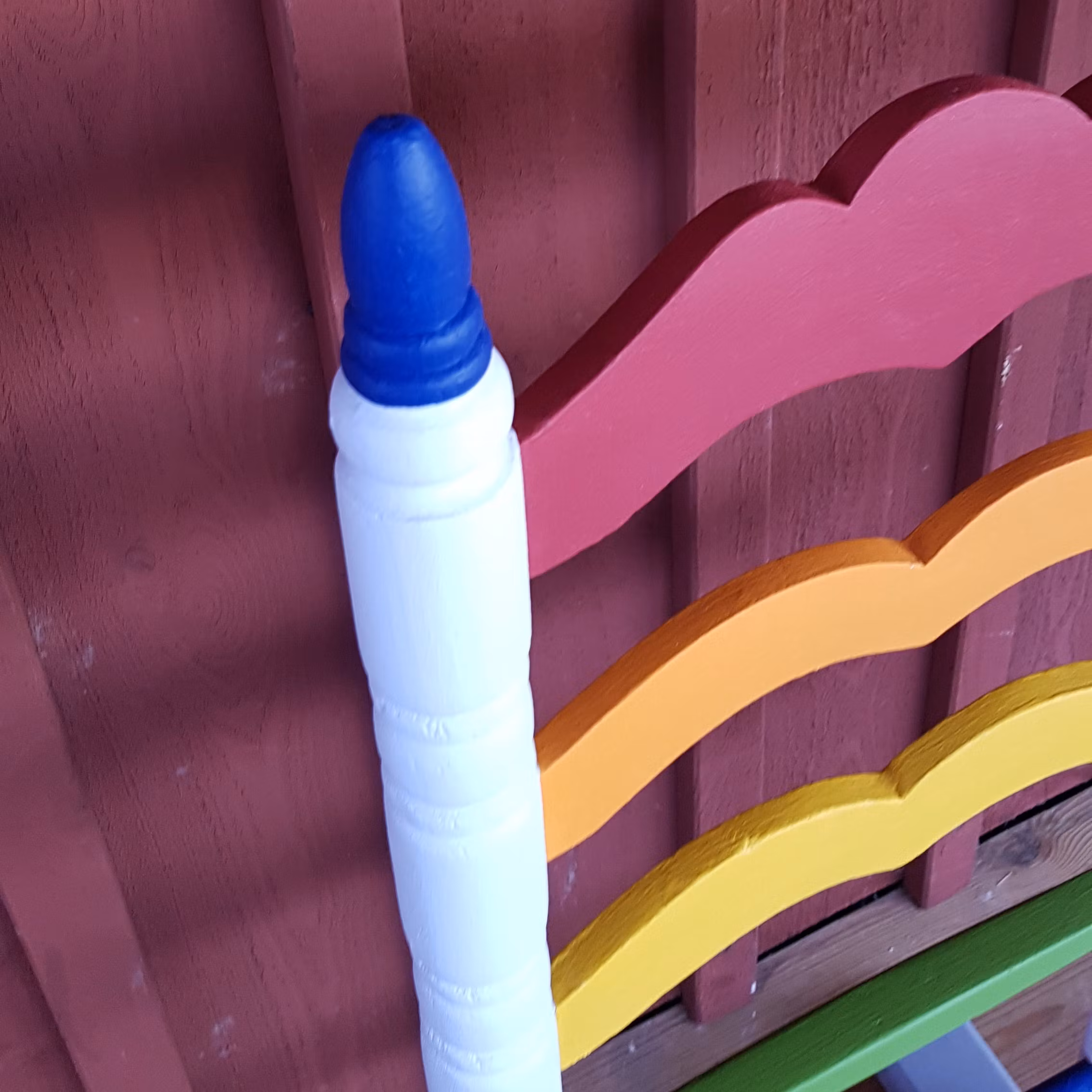 En färgglad, unik och klädsam betjänt till barnrummet. Den är tillverkad av en stol och målad i åtta olika nyanser med färg av märket #Autentico.