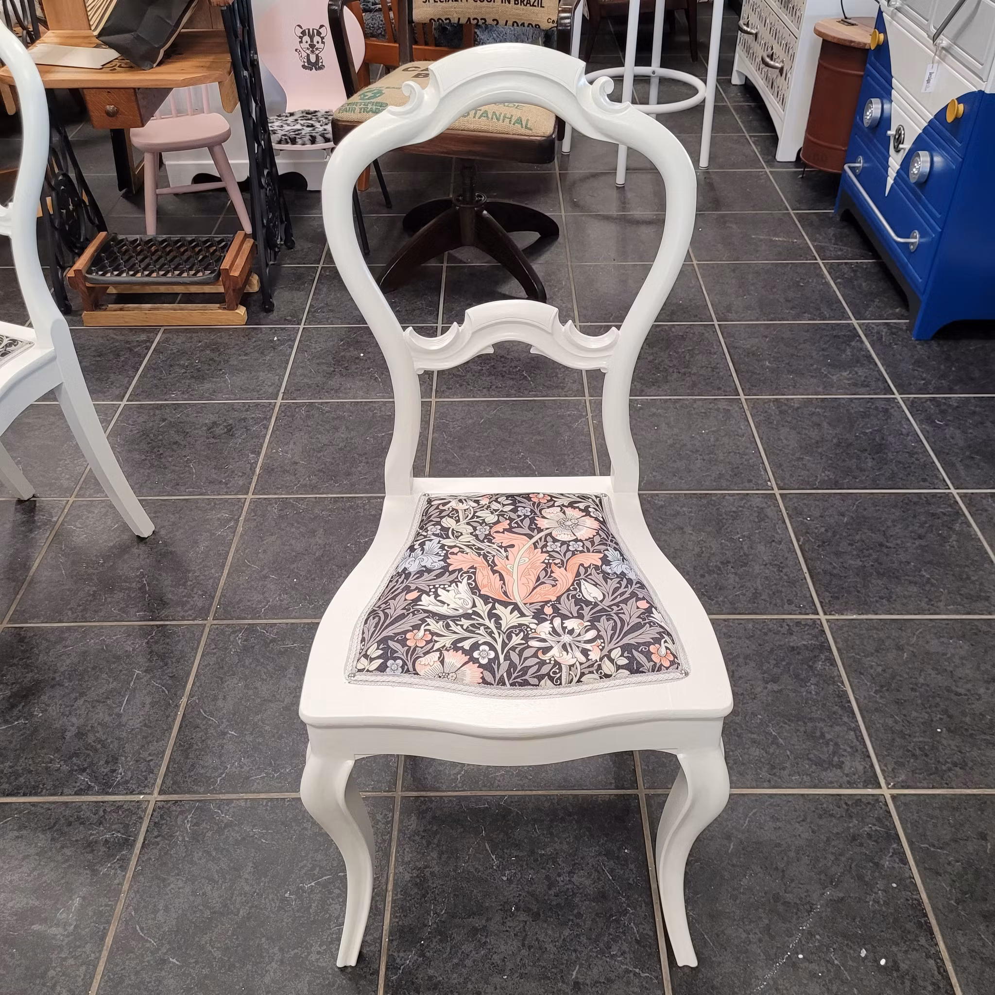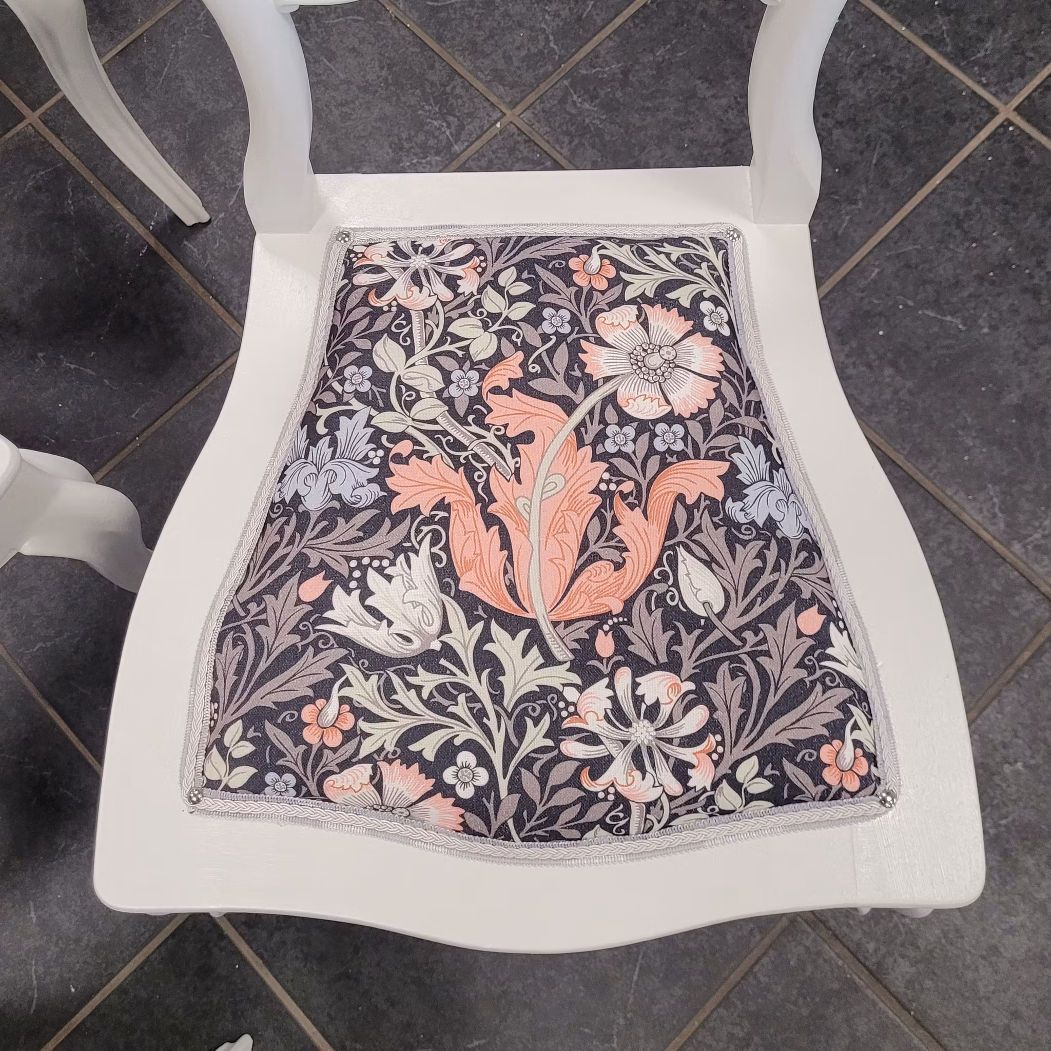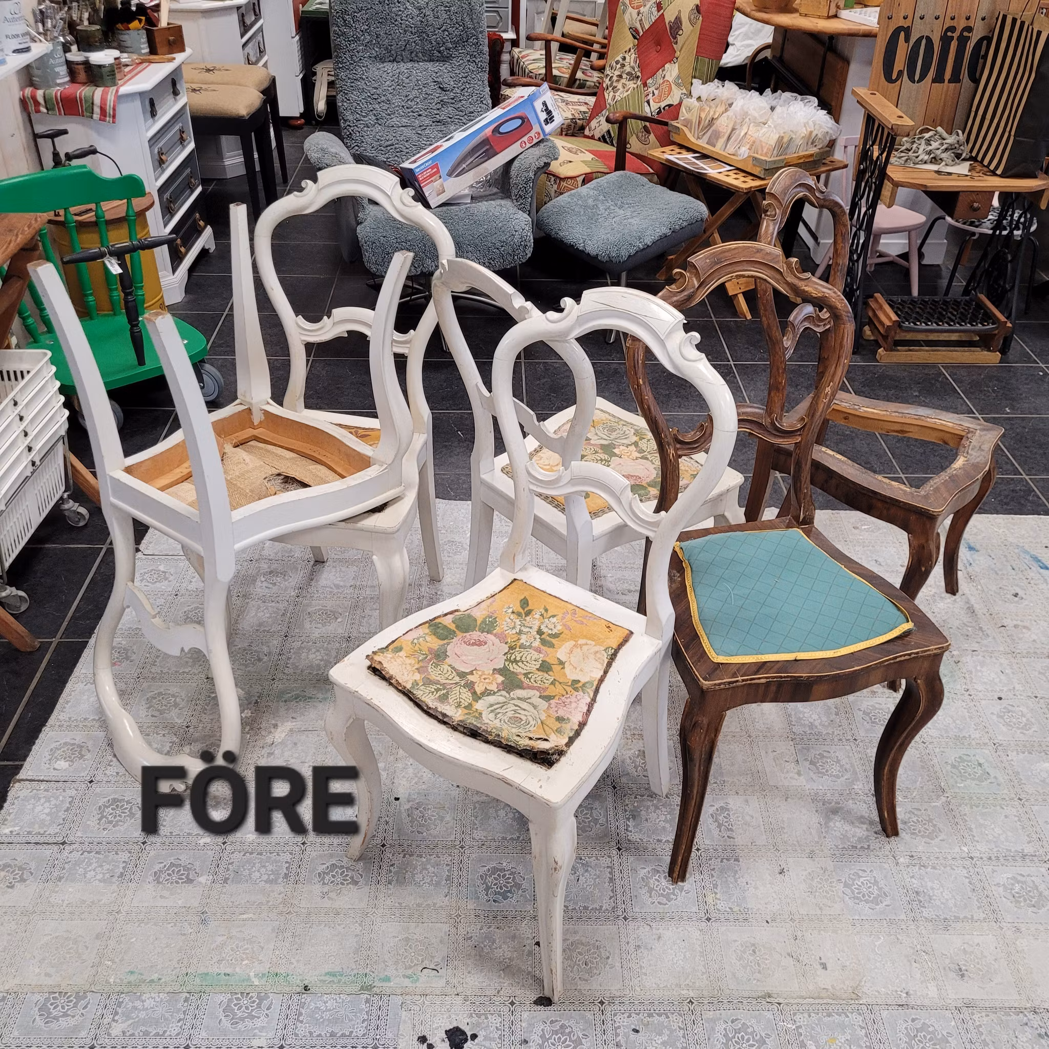 För kunds räkning har jag gett sex vackra stolar nytt liv. Ny förstärkt sits, ny klädsel och målat med kritfärg i kulören Chalk Grey. Det läckra tyget och bisband har kund köpt i den lilla men välsorterade tygbutiken 21:ans Tyger I Vadstena. Stolarna pryder idag ett hem i fina Hästholmen.