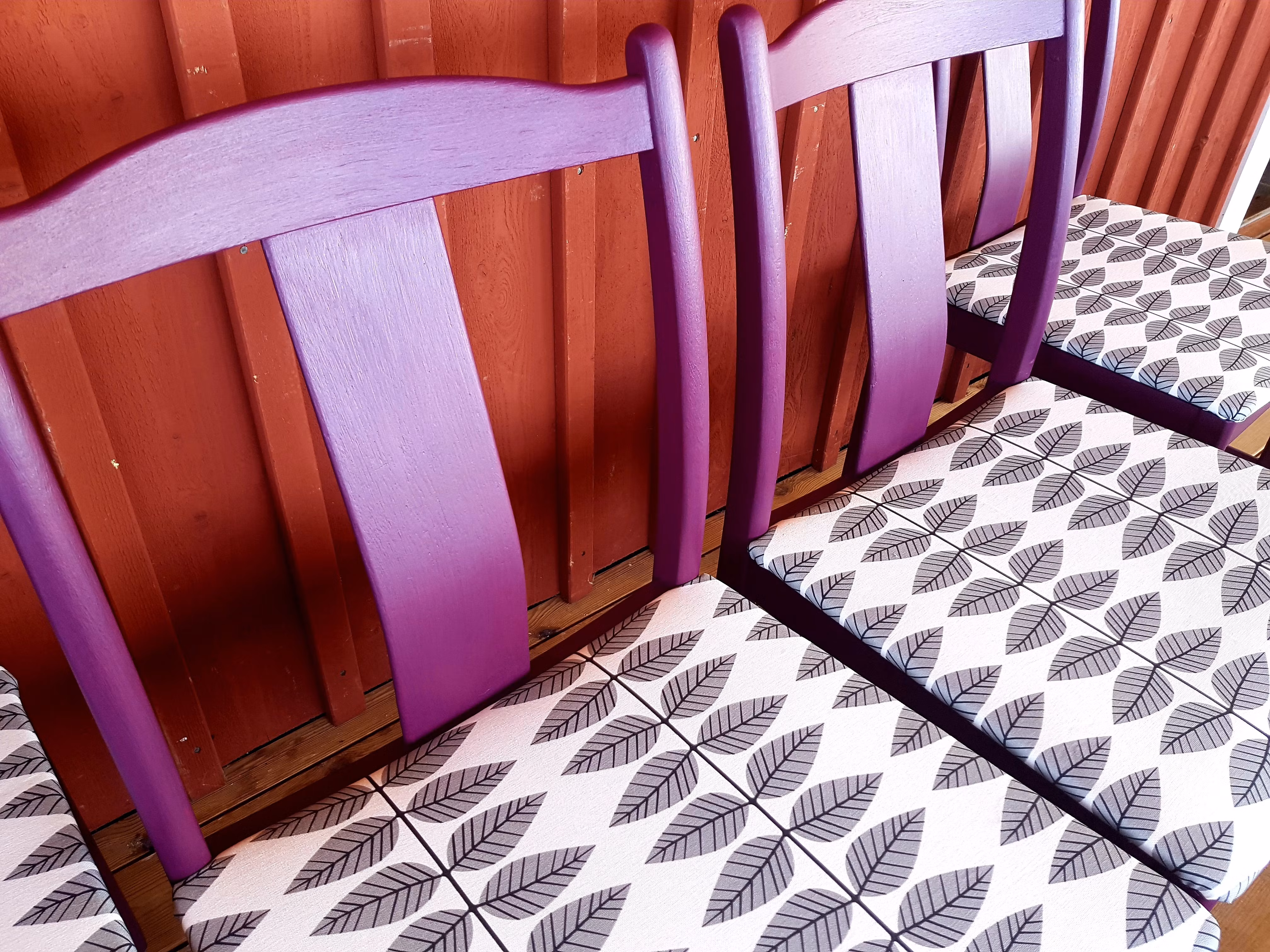 För kunds räkning har jag målat och satt tyg på 4 st stolar. De är målade i kulören #Plum