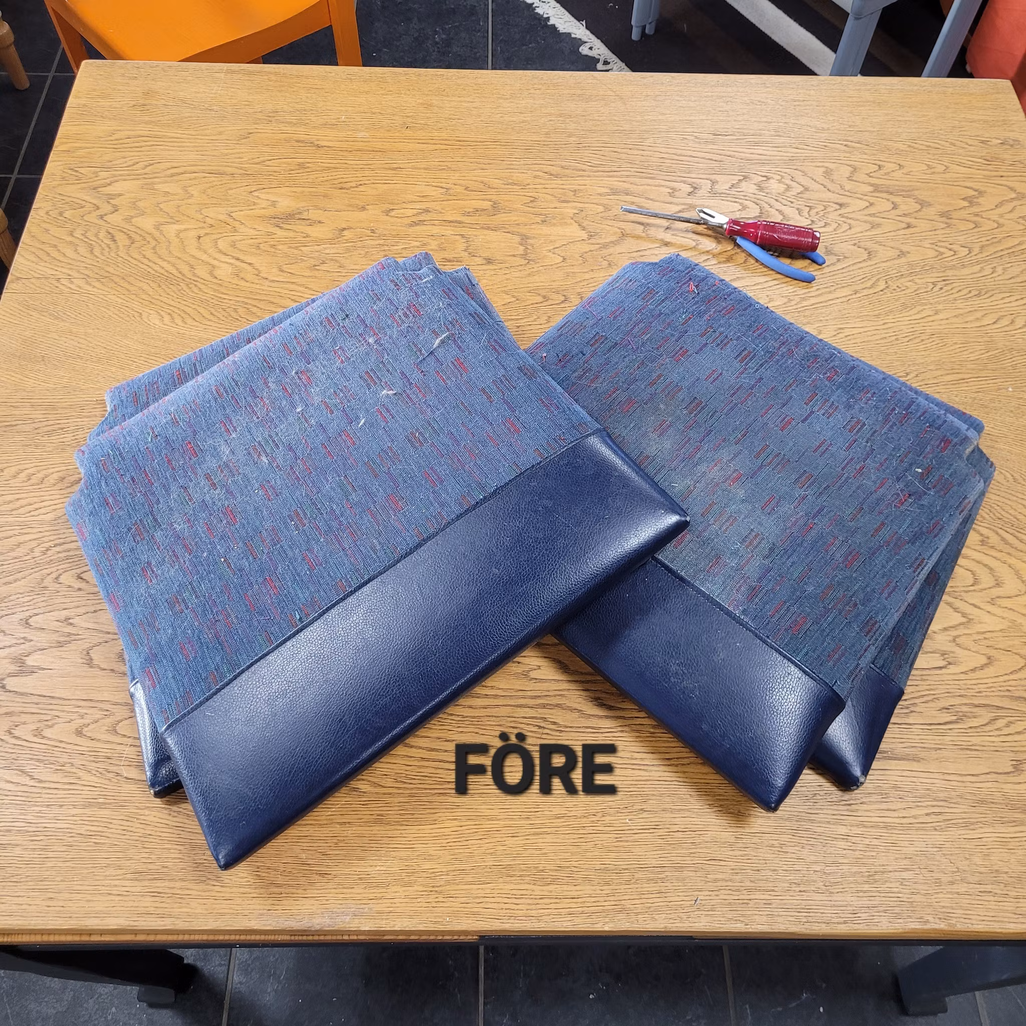 För kunds räkning har jag bytt stoppning och klädsel på totalt sex stycken stolsitsar. Det läckra tyget har kund köpt hos tyg.se