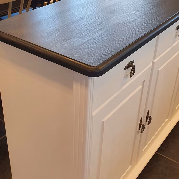 För kunds räkning har jag gett en furumöbel ny kostym. Målad med Autentico Versante Matt i kulörerna Ice Cream och Graphite. Själva bänkskivan är lackad med Autentico matt golvlack.