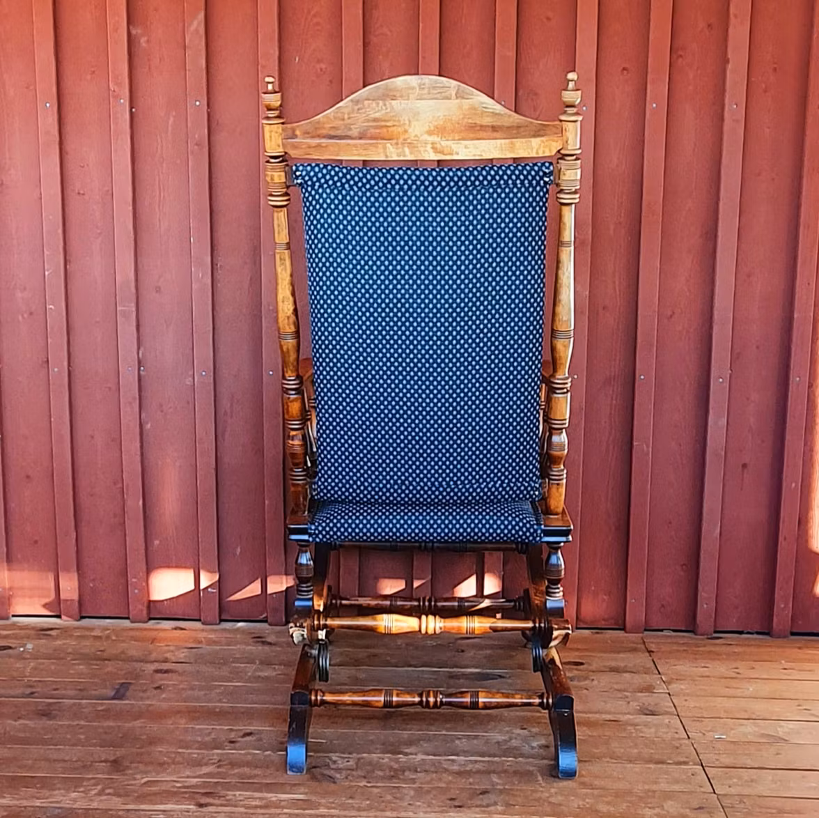 För kunds räkning har jag renoverat och klätt om en vacker klassisk amerikansk gungstol. Har bytt sadelgjord och gett gungstolen ny stoppning i sits och rygg. Tyget har kund själv inhandlat. Gungstolen pryder idag ett mjölbyhem.