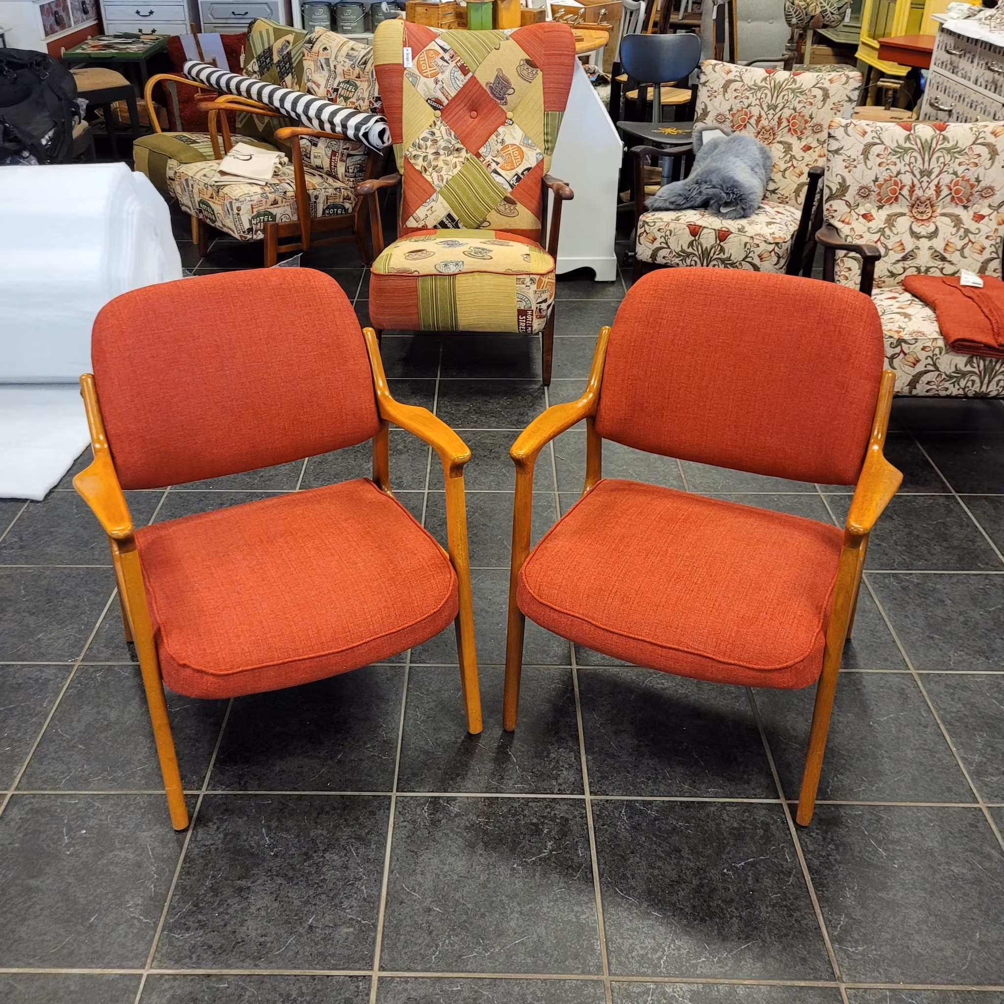 För kunds räkning har jag totalrenoverat två stilrena fåtöljer. Ny väv, nytt skumgummi och nytt tyg. Det läckra kvalitetstyget från @svptextil har kund köpt i den lilla välsorterade tygaffären 21:ans Tyger i Vadstena. Fåtöljerna pryder idag ett Ödeshögshem