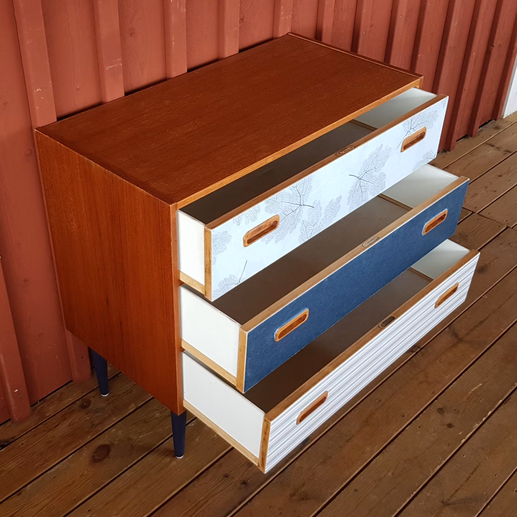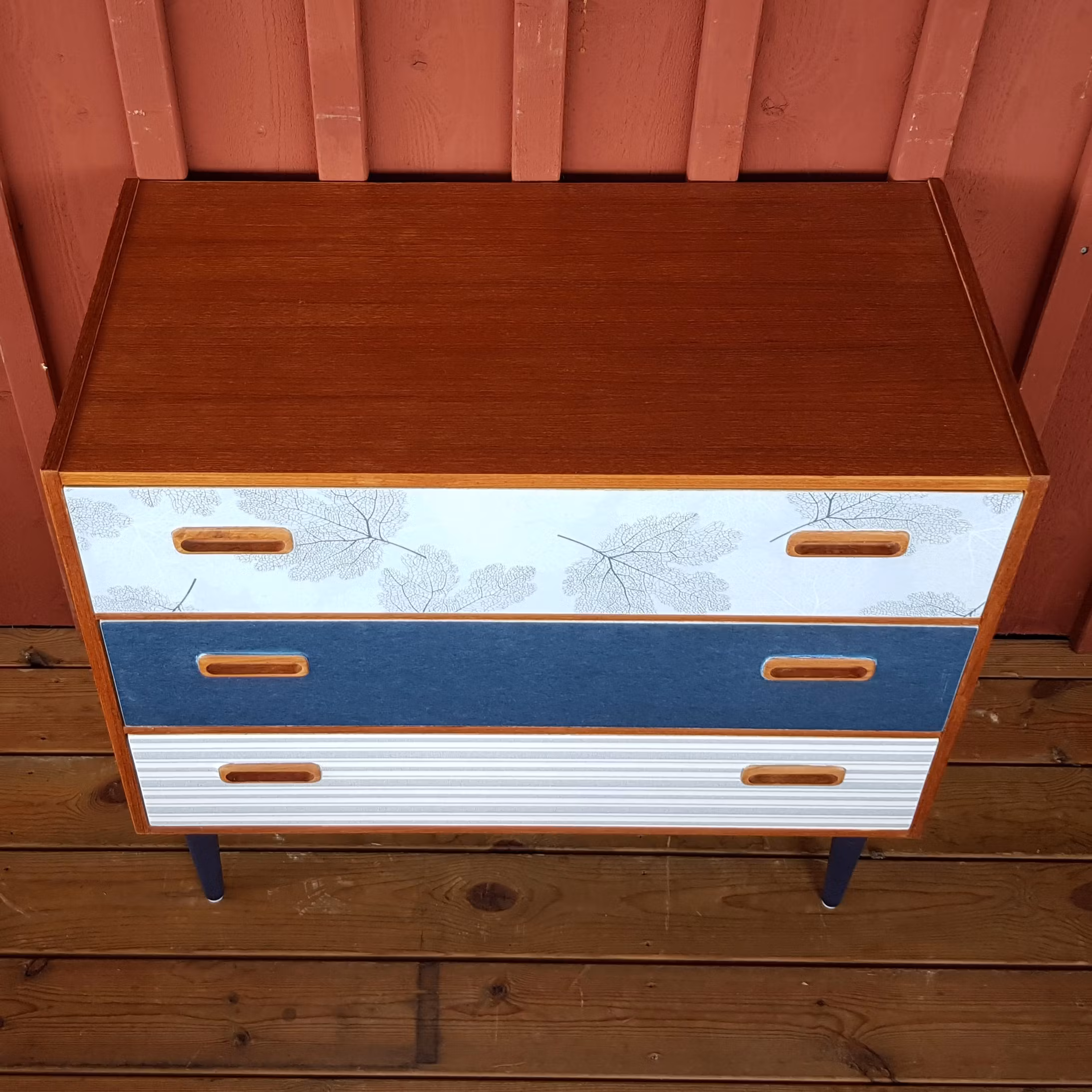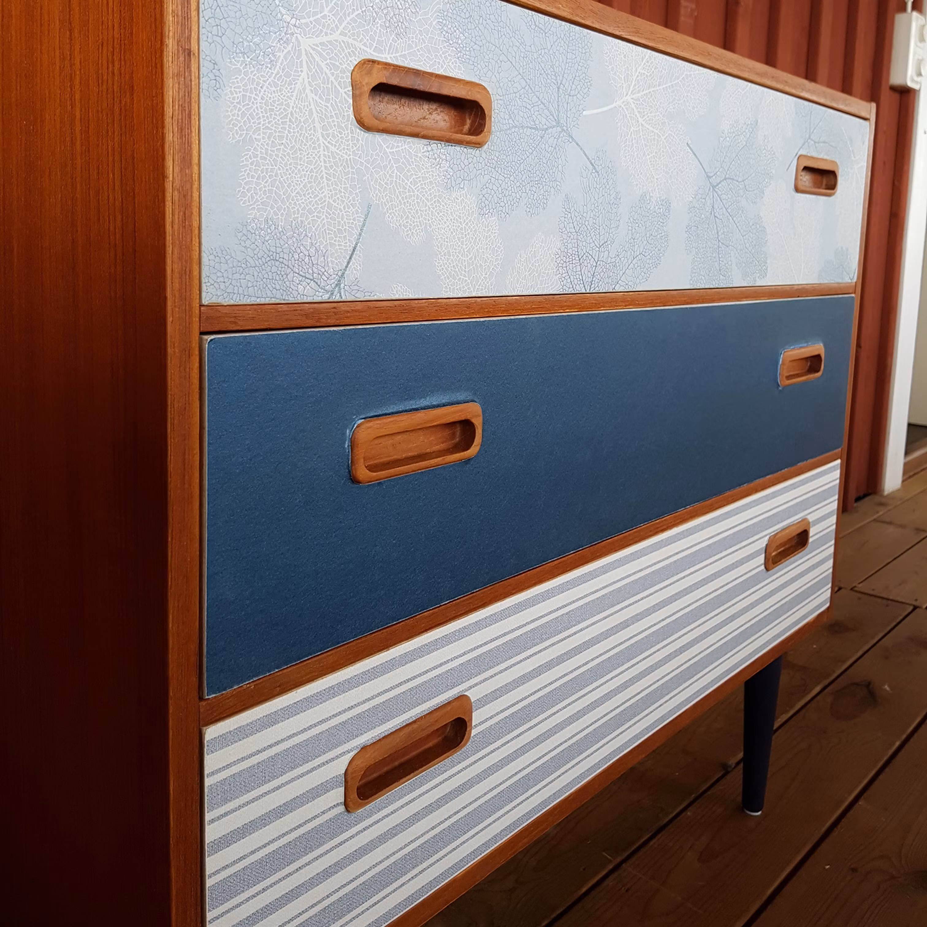För kunds räkning har jag slipat och fräschat upp en trött byrå. Behandlat stommen med #Autentico hårdvaxolja clear för tålighet och lyster. Och klätt lådfronter med tapeter i nyans av blått för att matcha kundens övriga inredning.