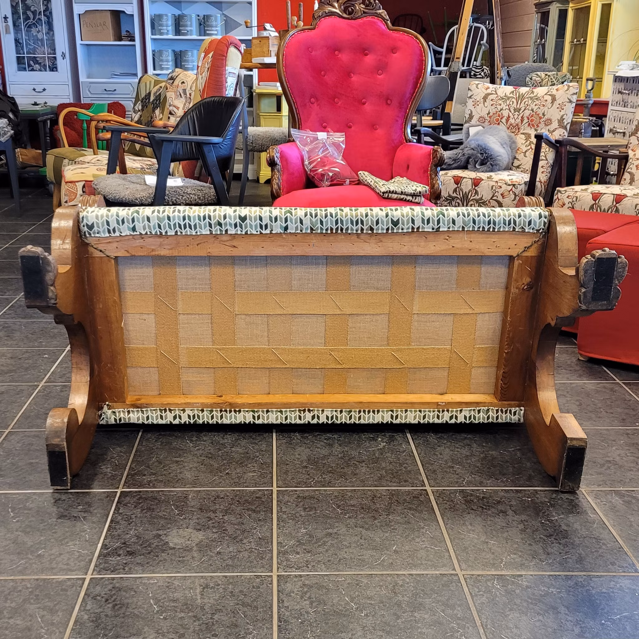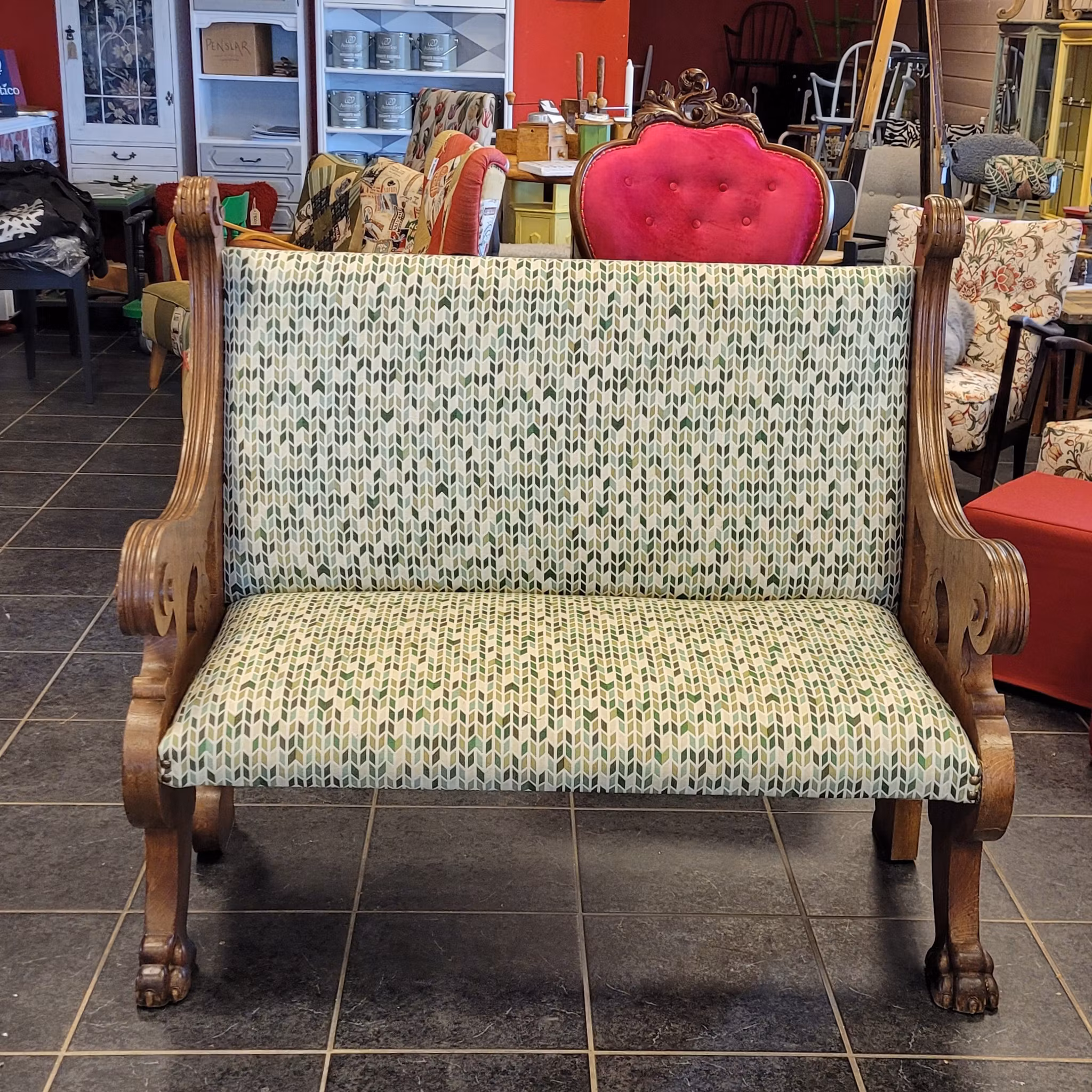 För kunds räkning har jag renoverat en läcker soffa med trädetaljer i ek. Trädetaljer är rengjorda betsade och behandlade med hårdvaxolja. Sits o rygg har fått ny sadelgjord, ny väv, kompletterande stoppning och nytt tyg. Det läckra tyget heter Jacquard Gobeläng Sicksack grön o är köpt hos tyg.se