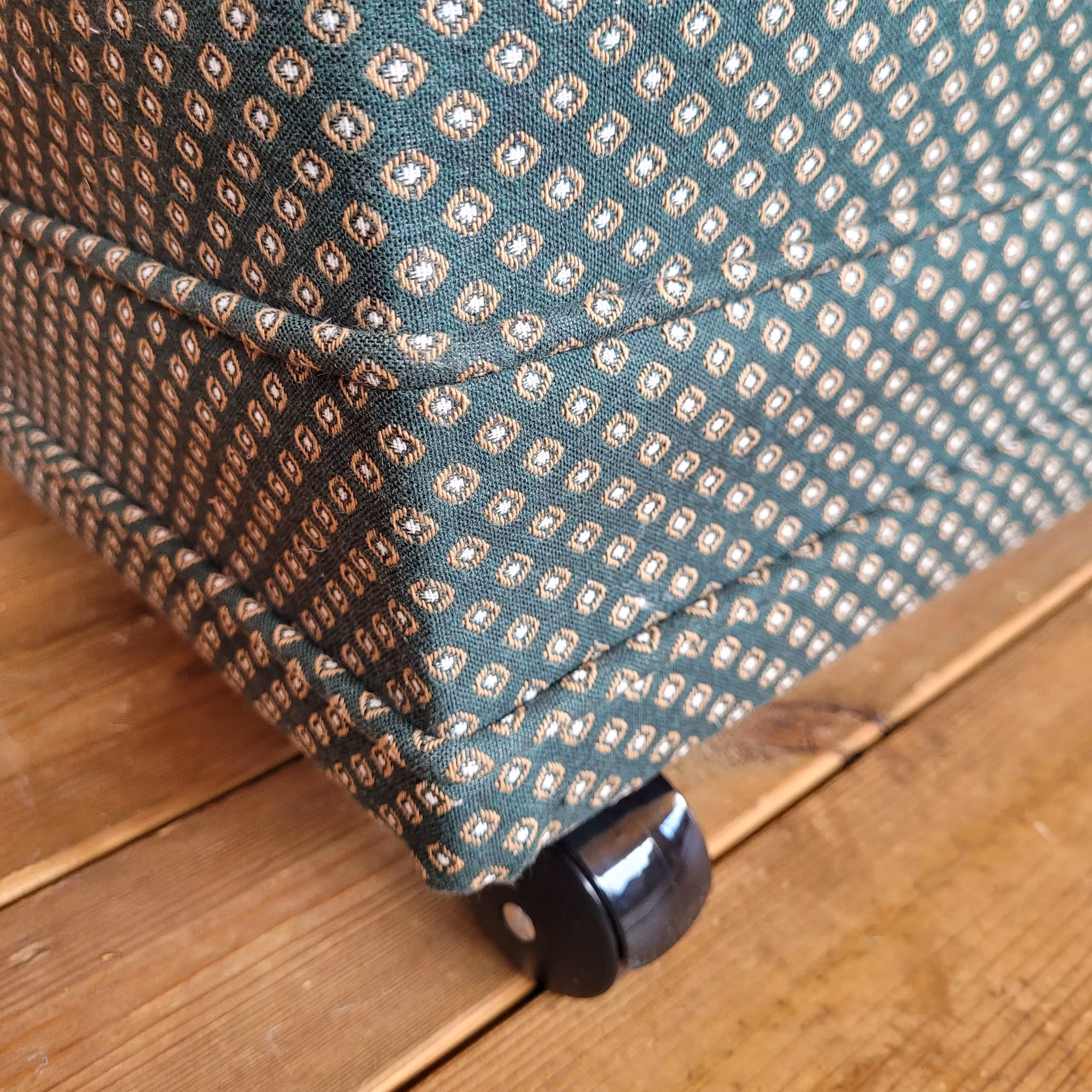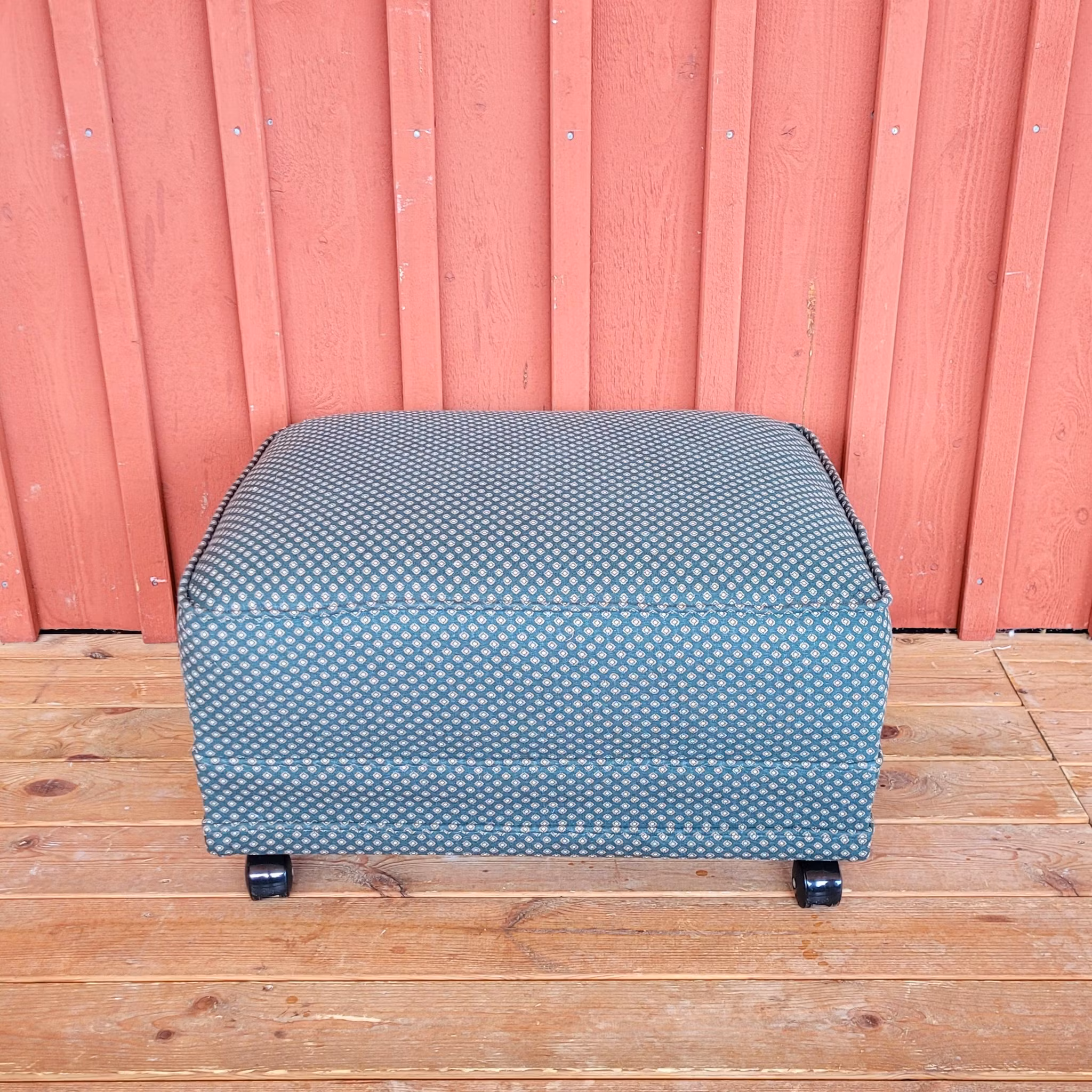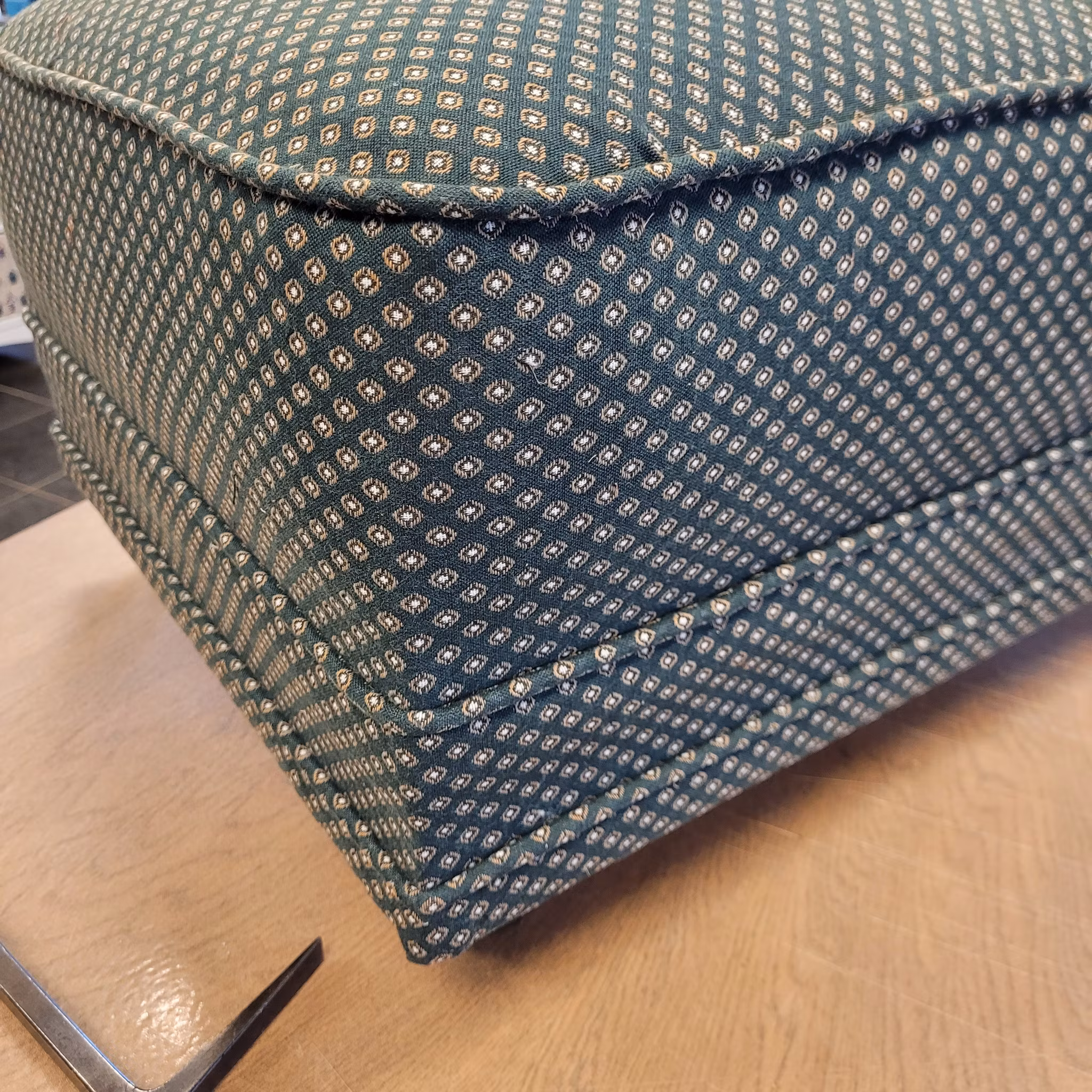 För kunds räkning har jag bytt klädsel på en praktisk fotpall/sittpuff. Till kunden har jag tidigare klätt om en elegant Karl-Johan soffa samma vackra gröna tyg.