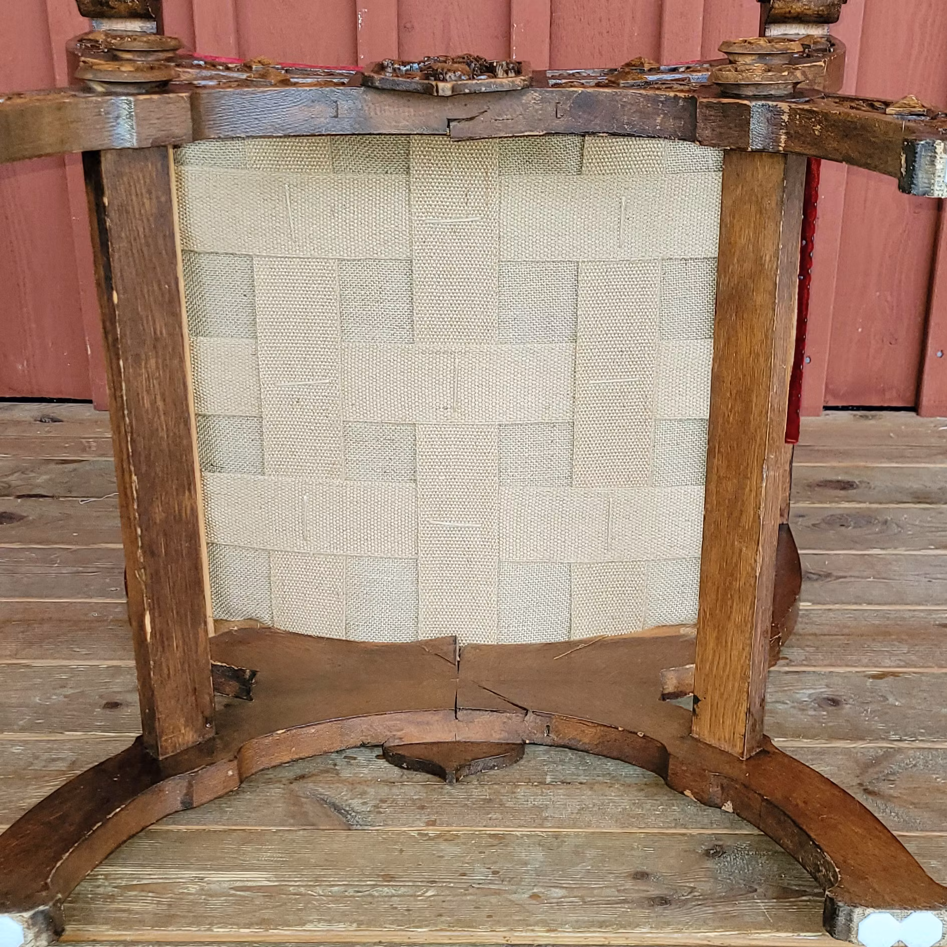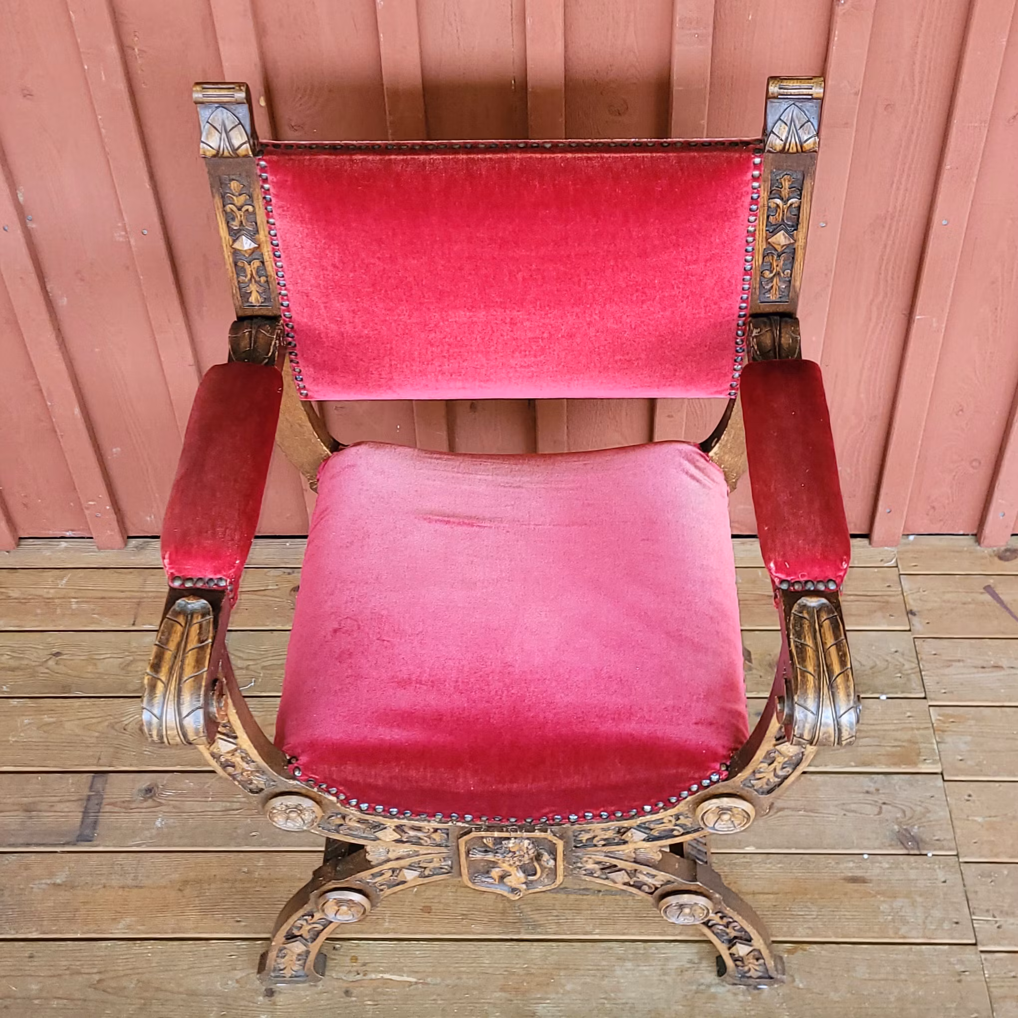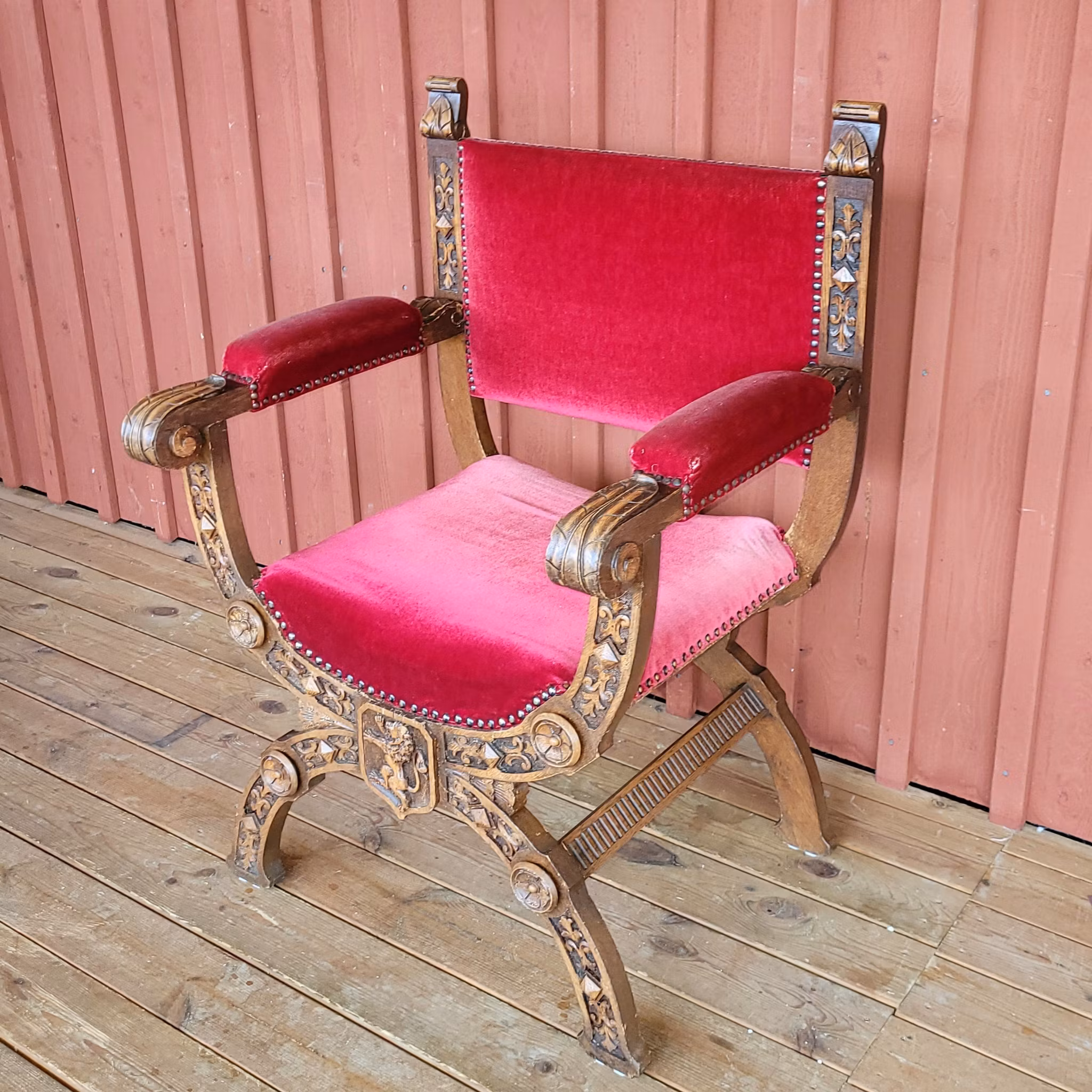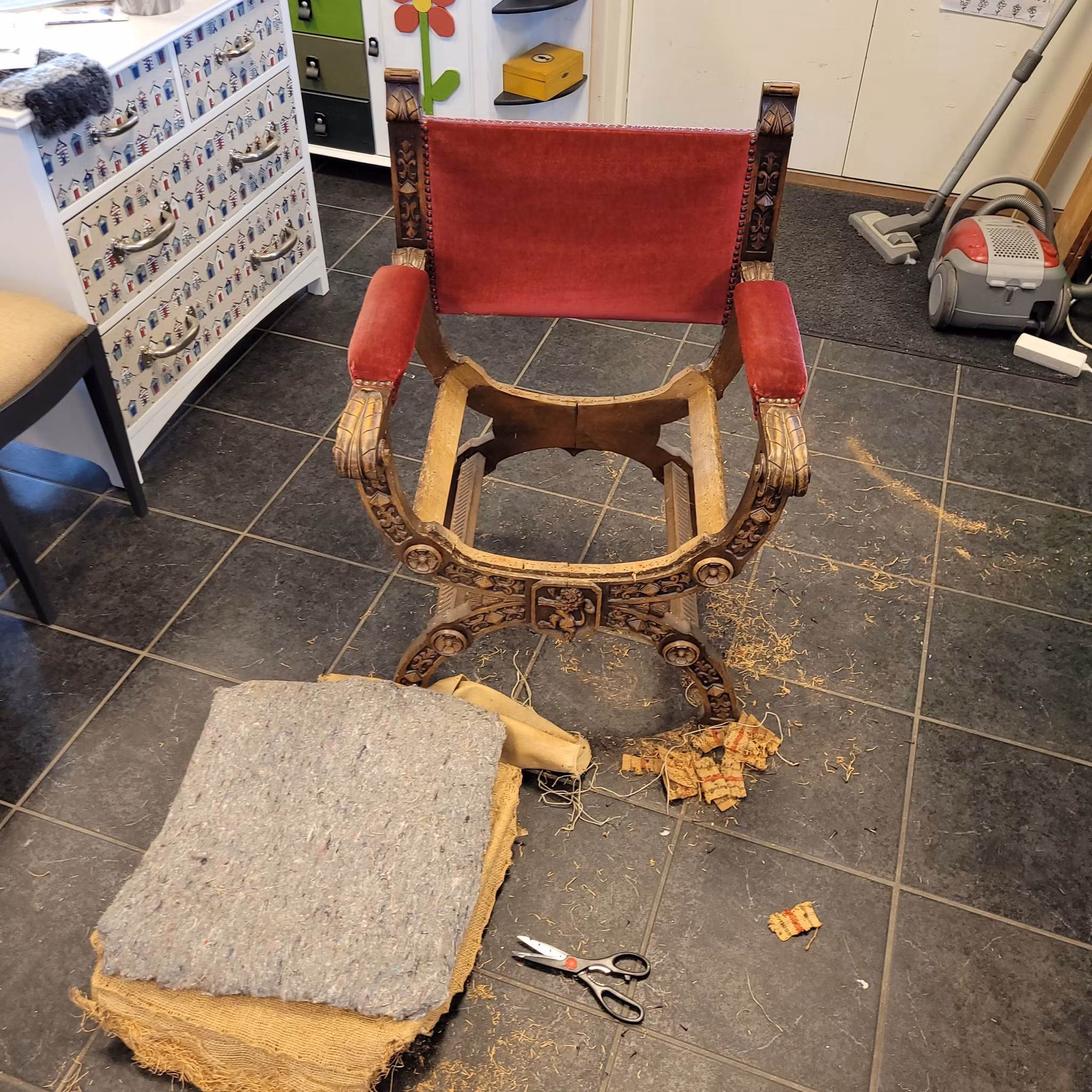 För kunds räkning har jag bytt sadelgjord och väv på en urläcker karmstol. Sammetstyget kunde jag återanvända.