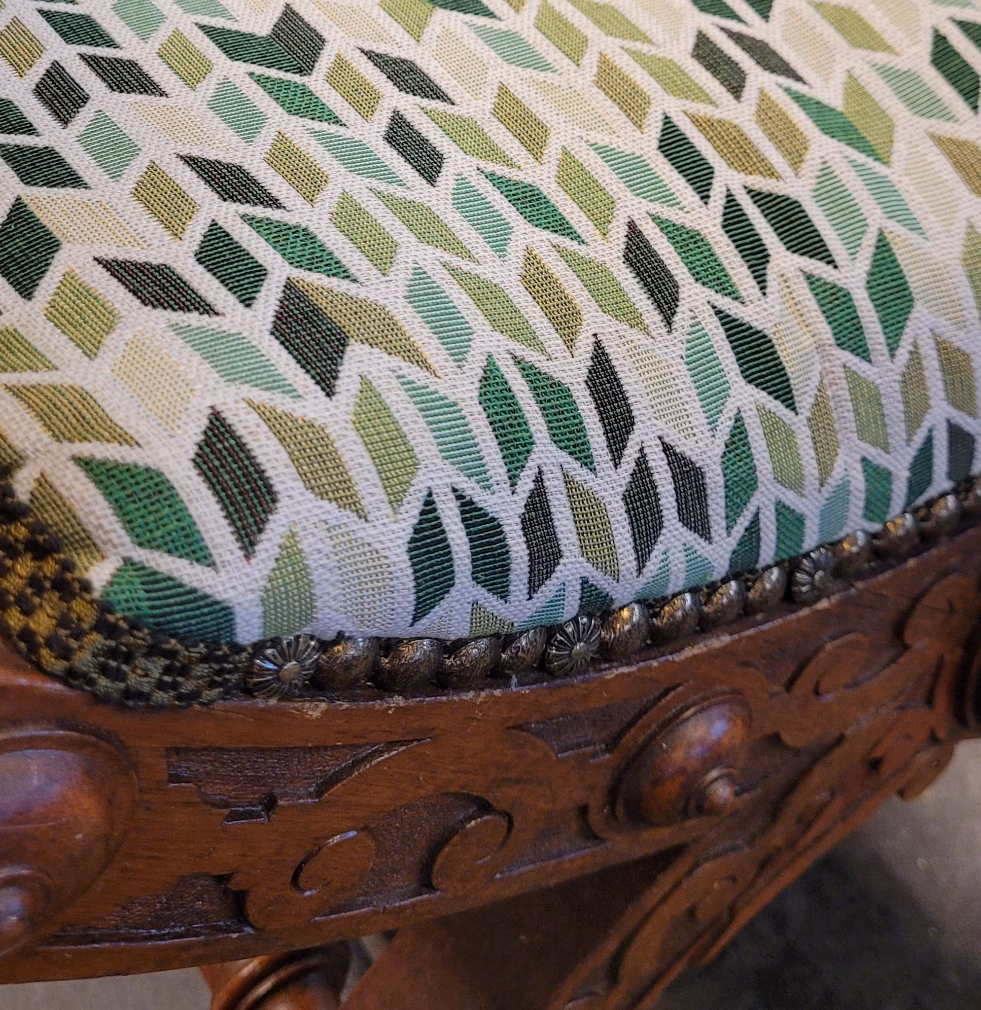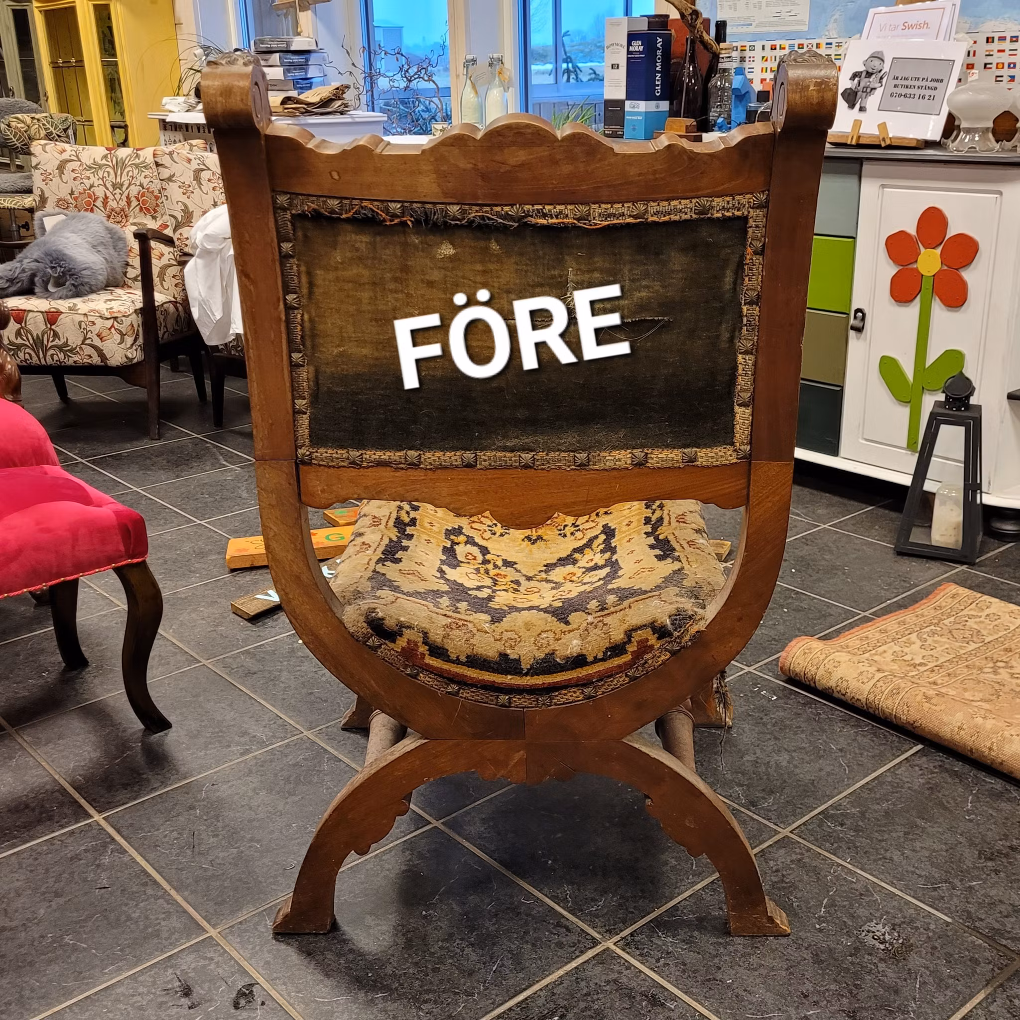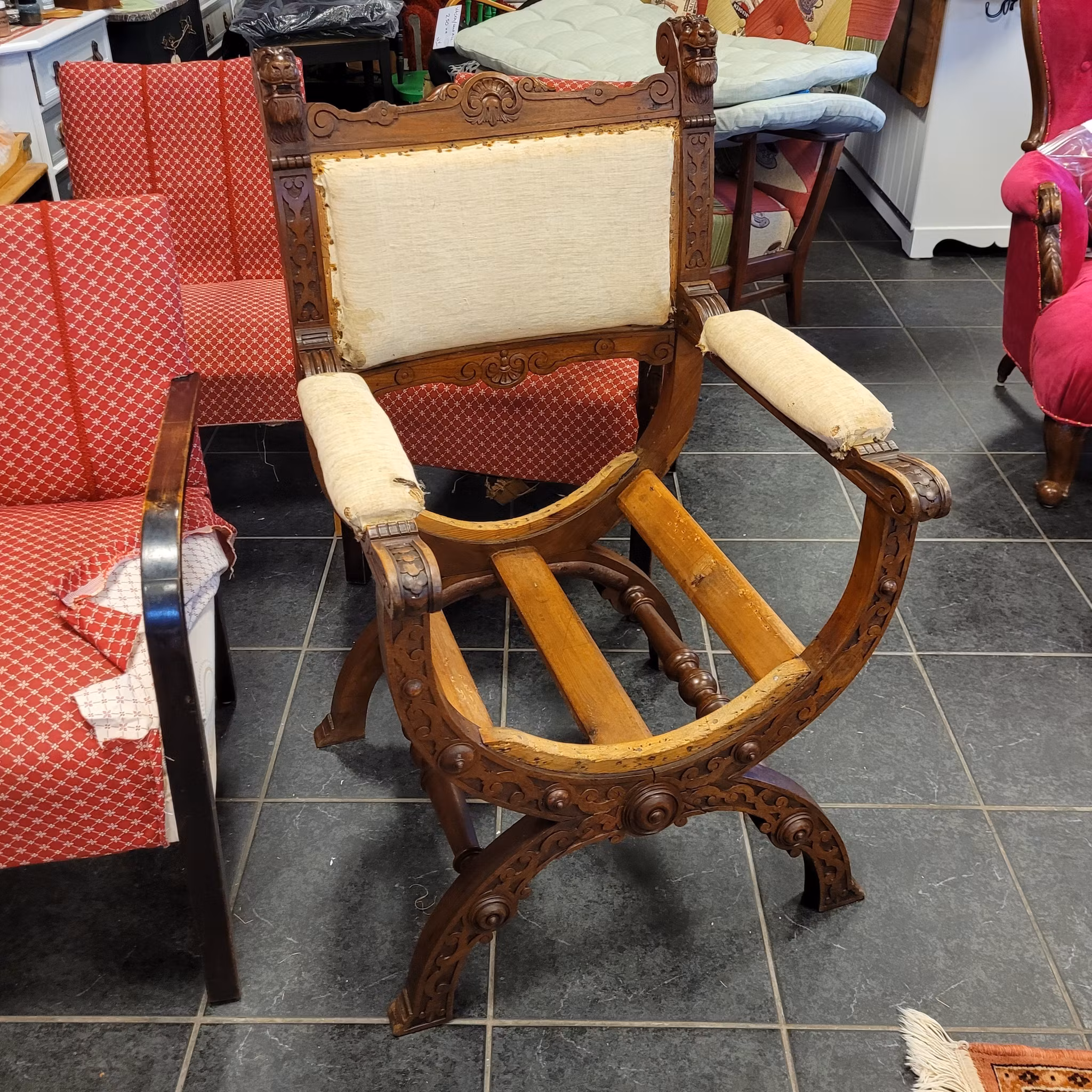 #möbelrenovering #möbeltapetsering #karmstol #ekstol #lejonhuvud #gjuteväv #sadelgjord #tygse