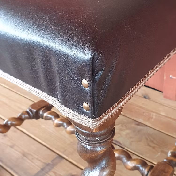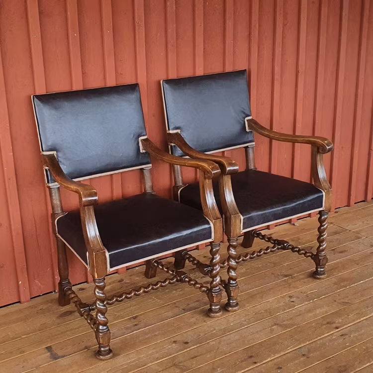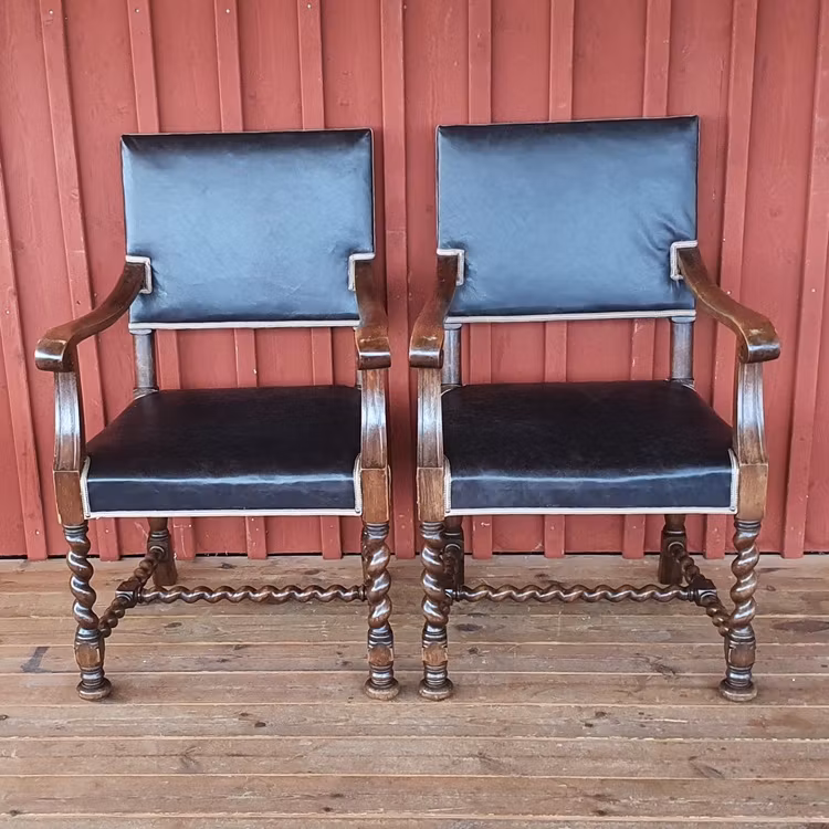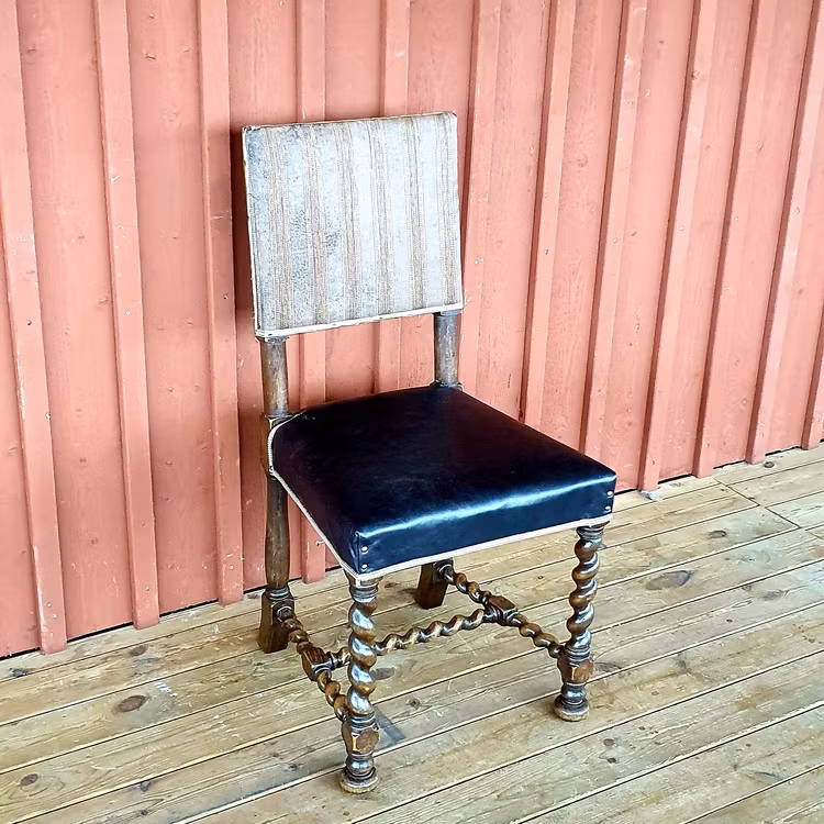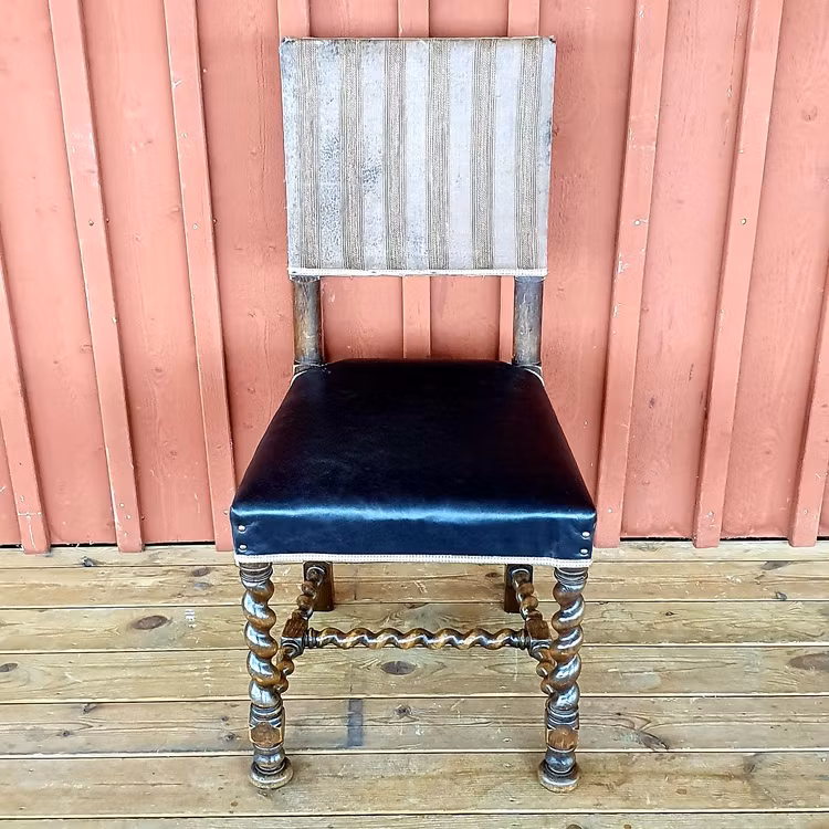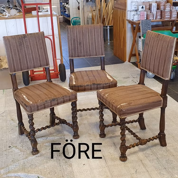 För kunds räkning har jag klätt 2 st karmstolarna och 10 st matsalsstolar med äkta skinn som kund själv köpt via Målerås Läder. Av emotionella skäl har kunden valt att tillsvidare behålla klädsel på stolsryggar. Stolar o klädsel har fin släkthistoria som kunden vill värna om. Därav har kund även valt att sätta bisband/möbelband vilket man traditionellt inte brukar göra på Läder. Men gillar människor som vågar tänka utanför boxen. Trädetaljer har jag rengjort och behandlat med Autentico hårdvaxolja clerar. Till stolarna har det gått åt över 1000 möbelnubb. Men blånaglar har jag lyckats undvika.