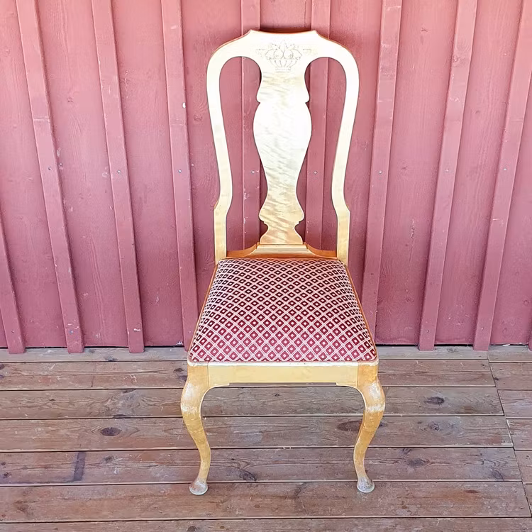 För Svenska kyrkans räkning har jag klätt om en vacker soffa och sex stolar. Tyget heter Svaneholm röd/guld och är inköpt på Rosahuset .