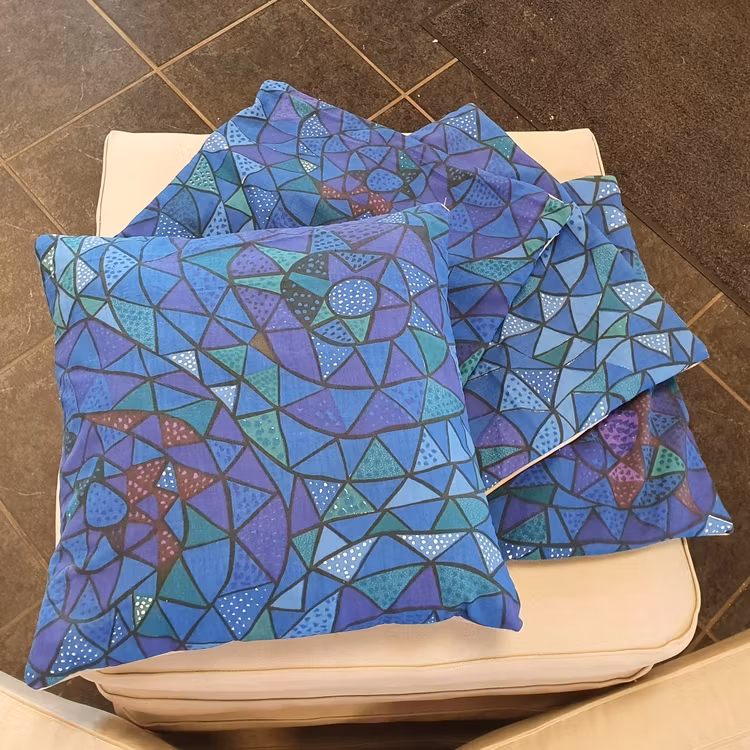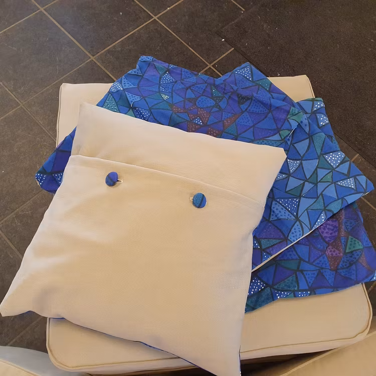För kunds räkning har jag gett trötta o slitna soffdynor nytt utseende. Sömmar har jag sytt med passpoalsöm och knappar och kuddfodral har jag sytt och tillverkat av klassiskt tyg designat Viola Gråsten.