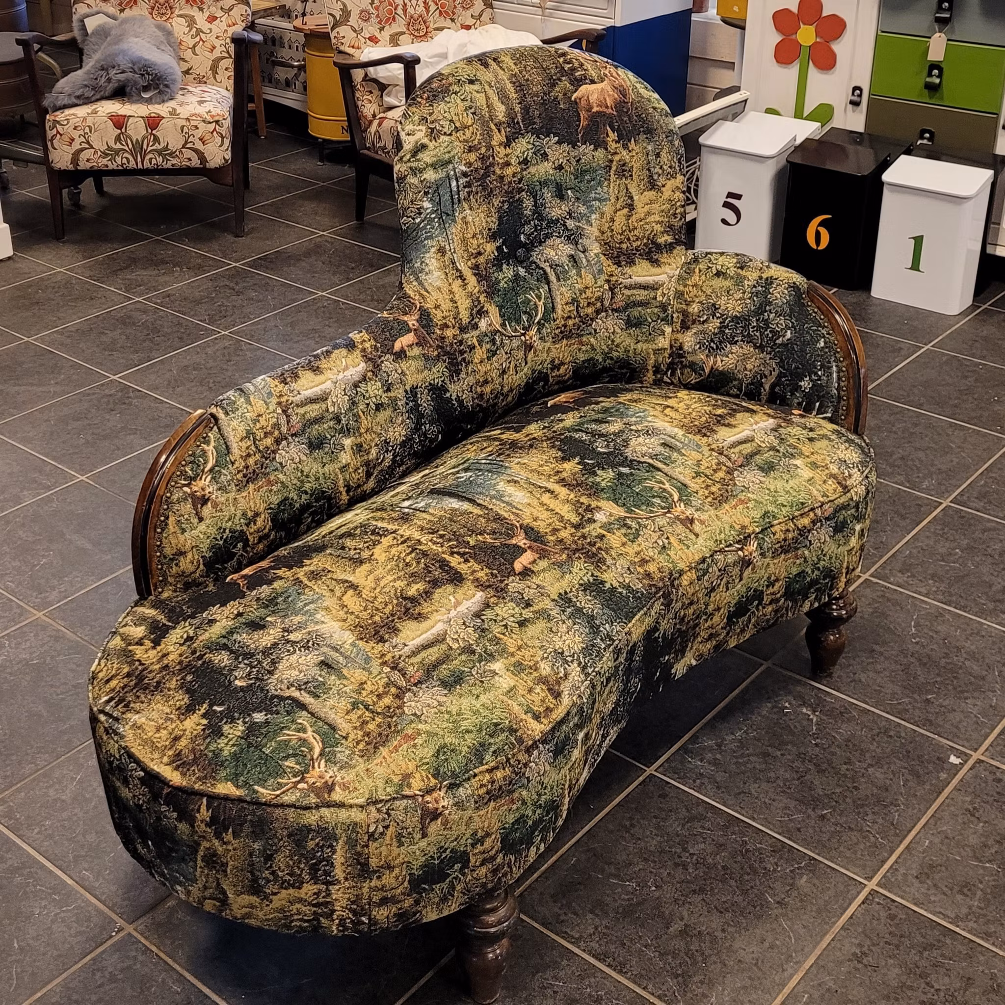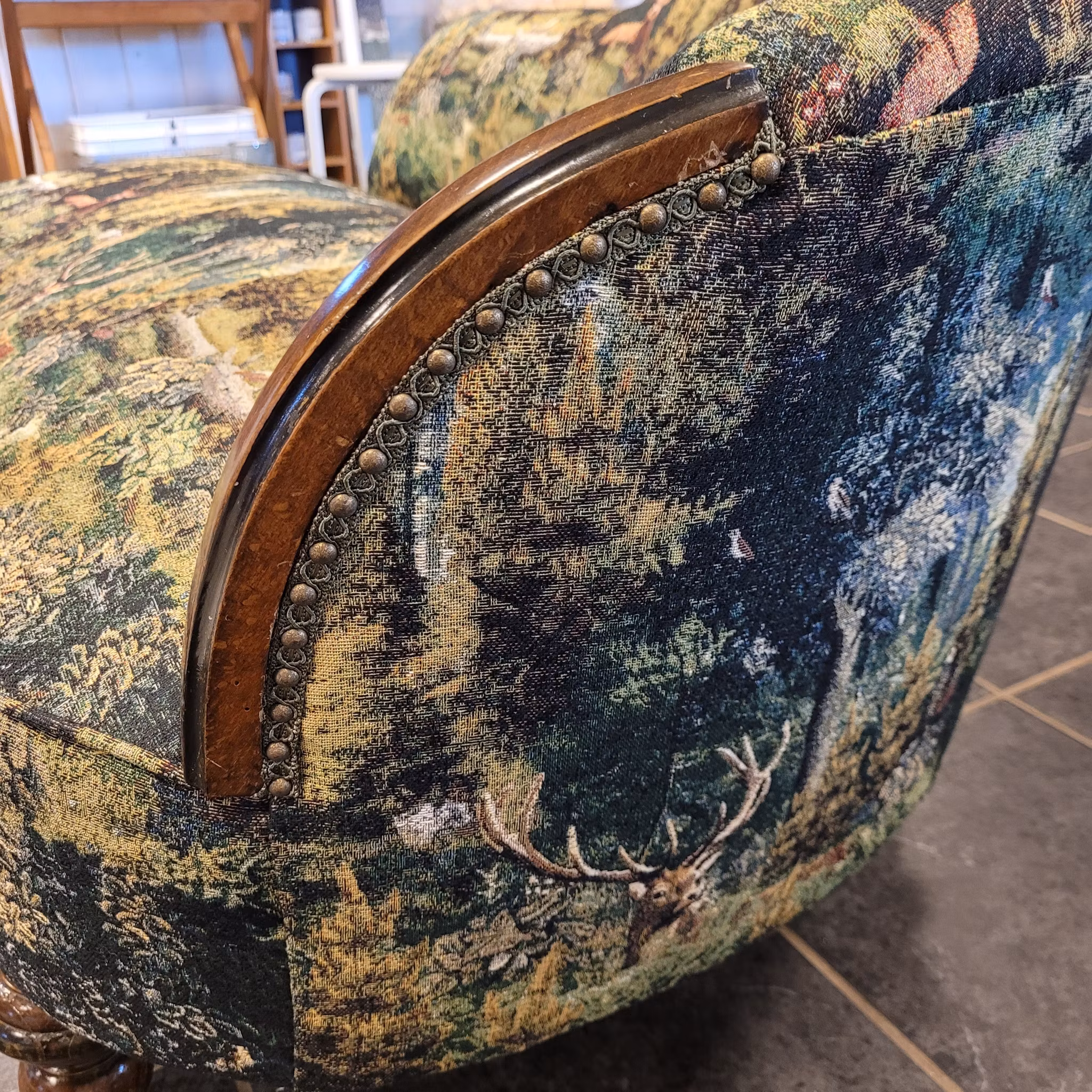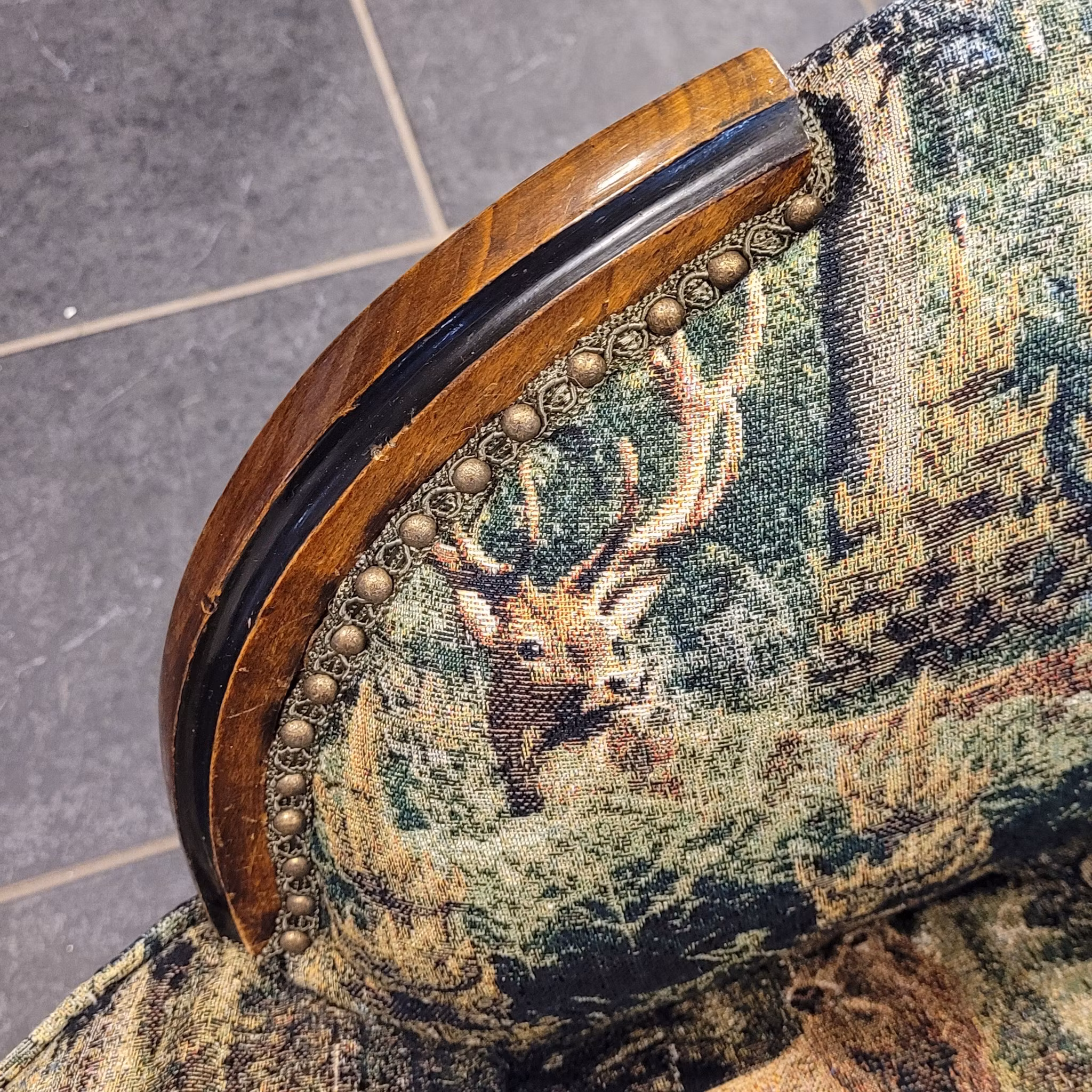 För kunds räkning har jag renoverat och klätt om en läcker Schäslong. Det läckra jaquard-tyget, Ancient forest gobeläng har kund köpt hos @nordisktextil.se . Spännande fynd i resårbotten. En enkrona från 1945. En lyckopeng till kunden
