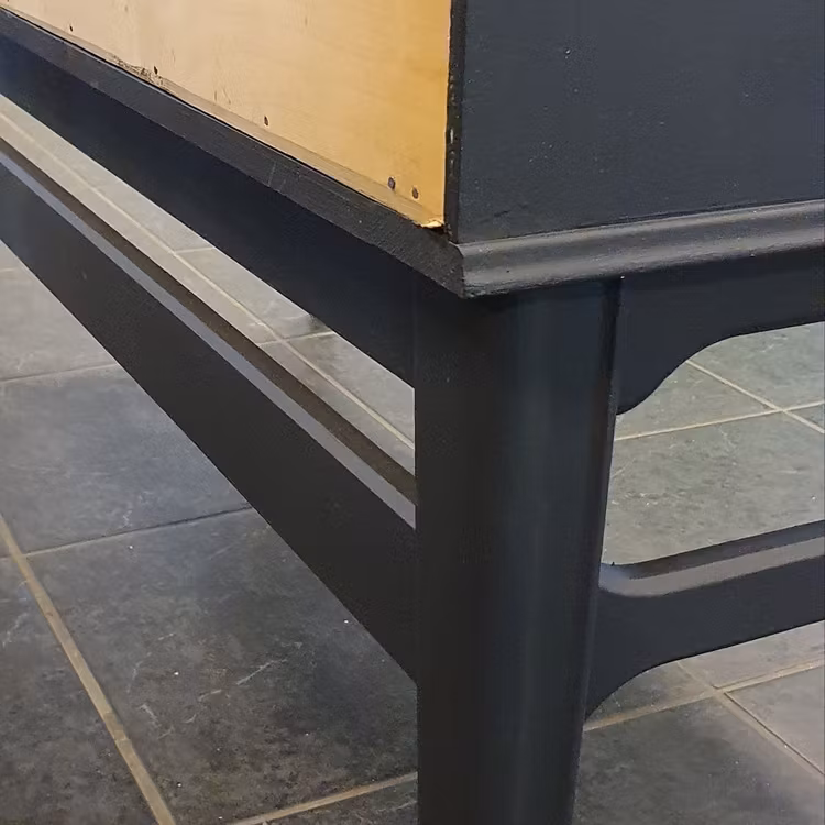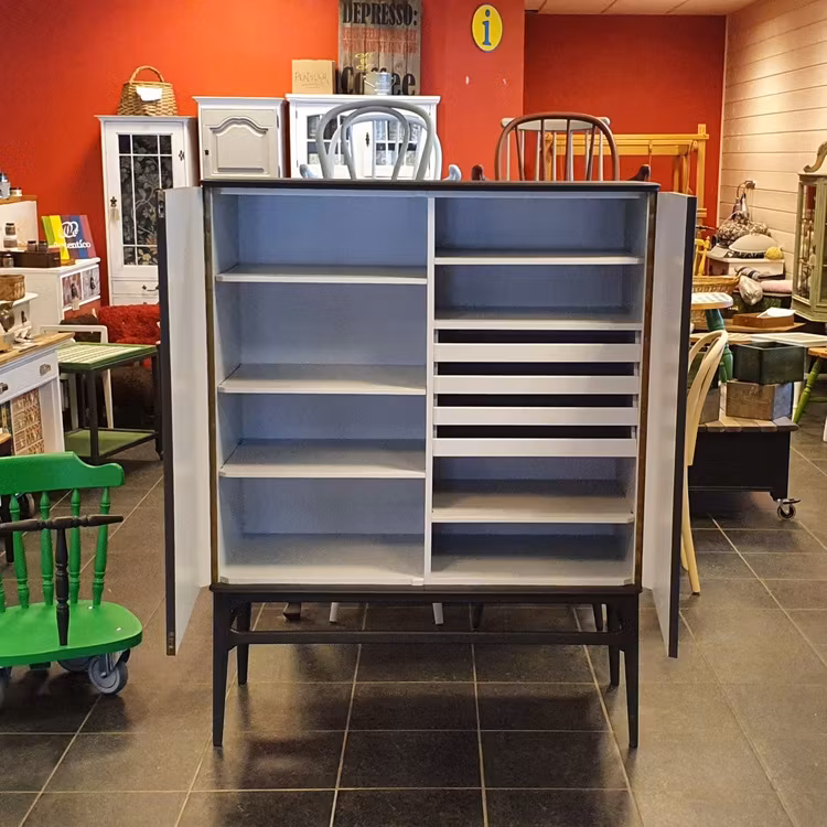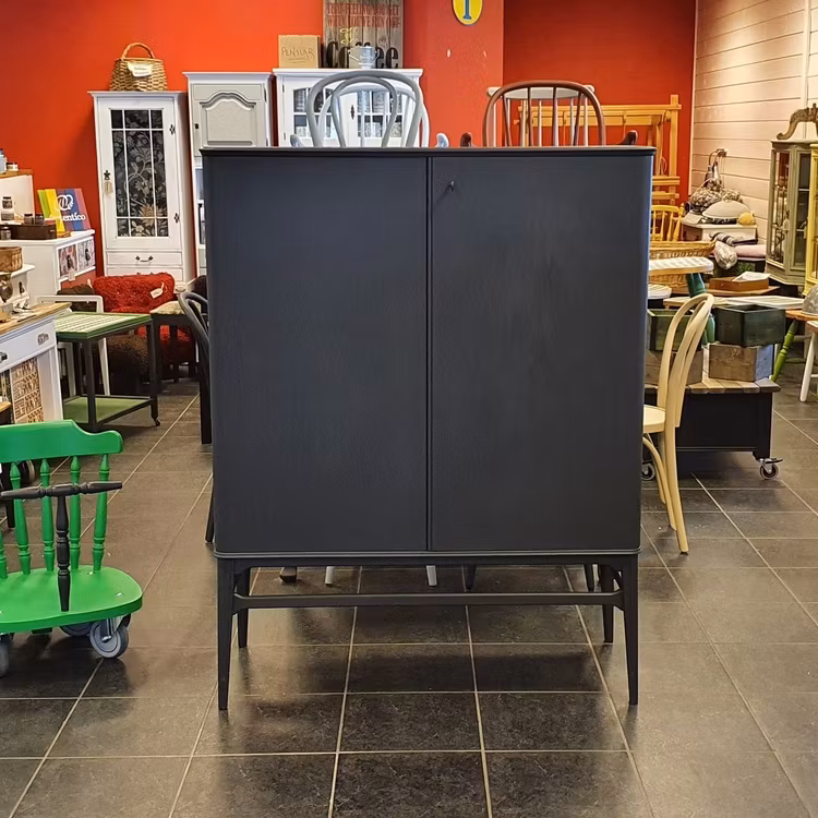 För kunds räkning har ett elegant serveringsskåp fått ny kostym. Invändigt målat med kritfägen Autentico Versante Eggshell i kulören i Gris. Och utvändigt med Autentico Versante Matt i kulören Graphite. Själva dekoren var i väldigt dåligt skick så därav valde jag i samråd med kund att plocka bort den helt.