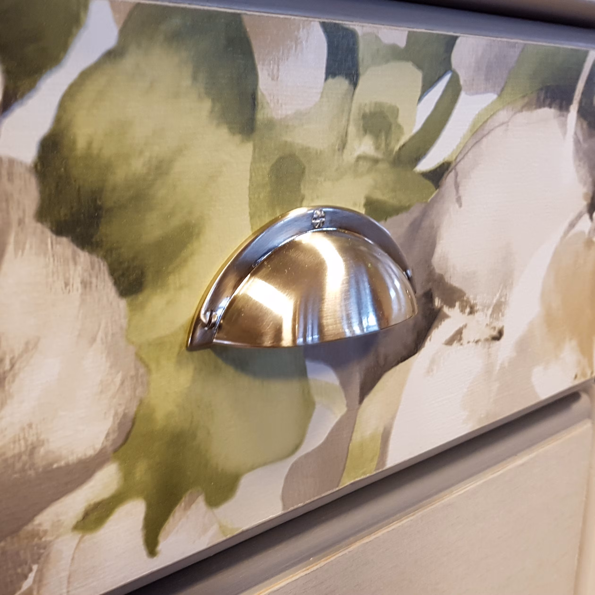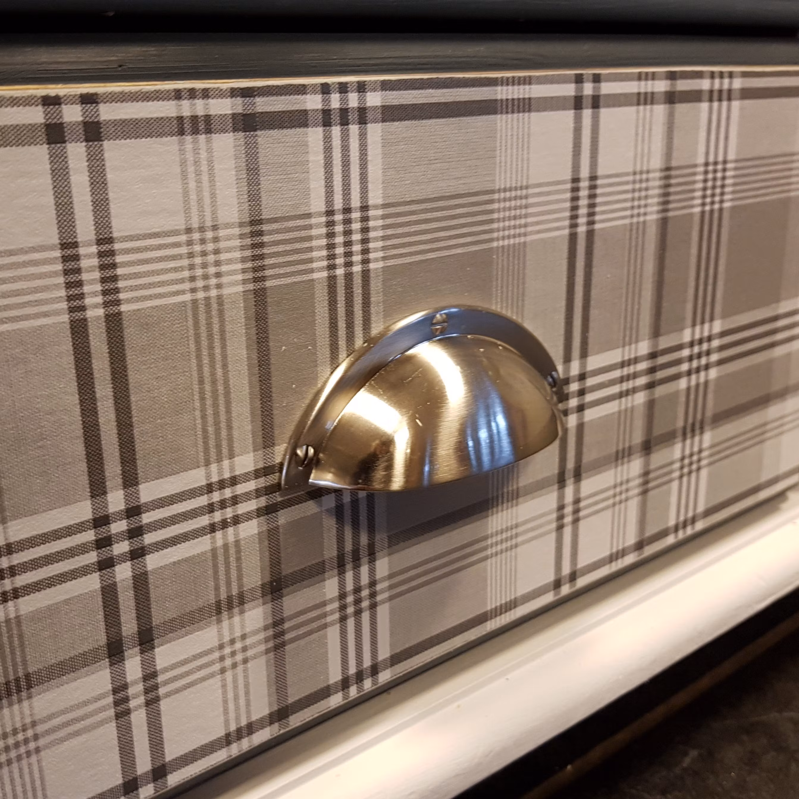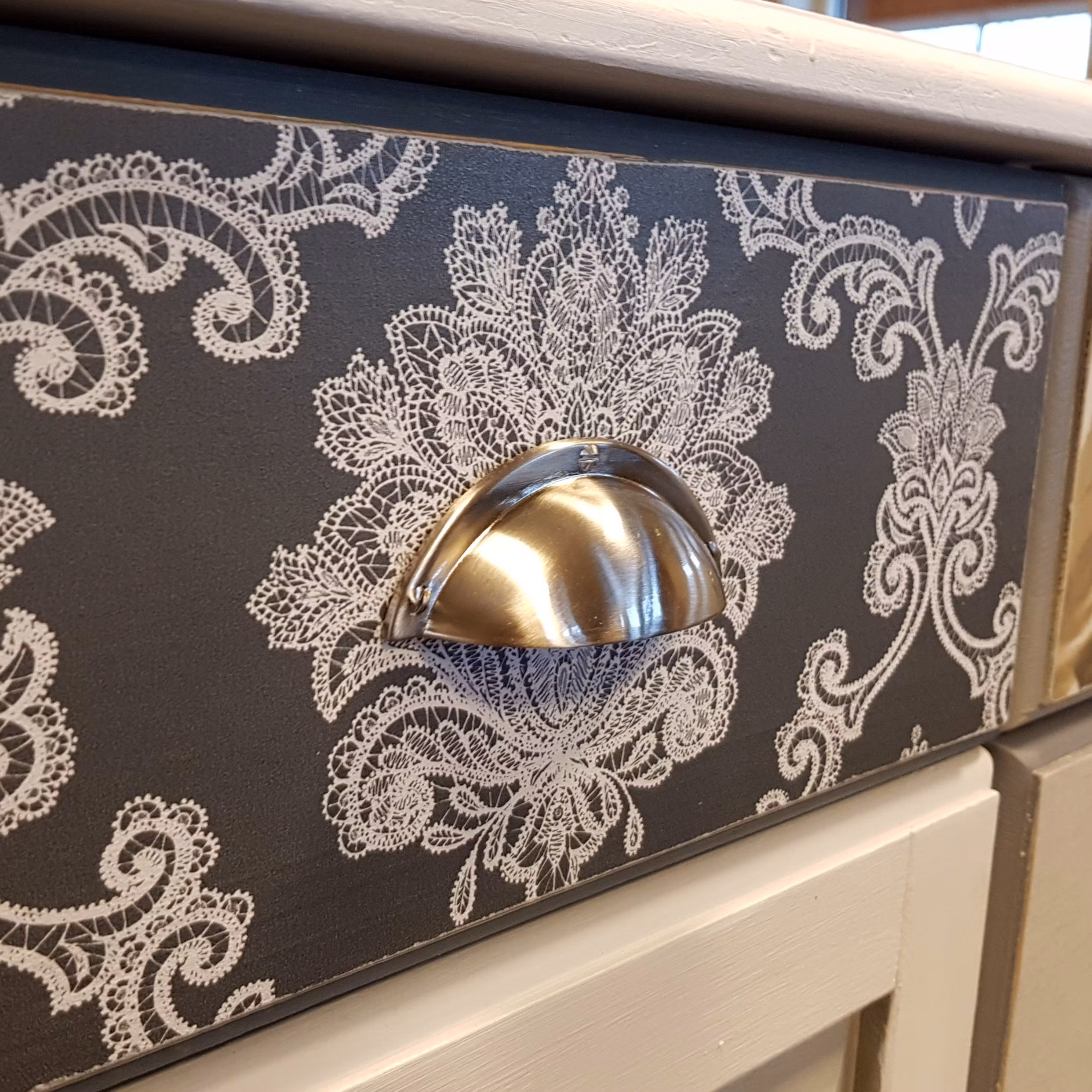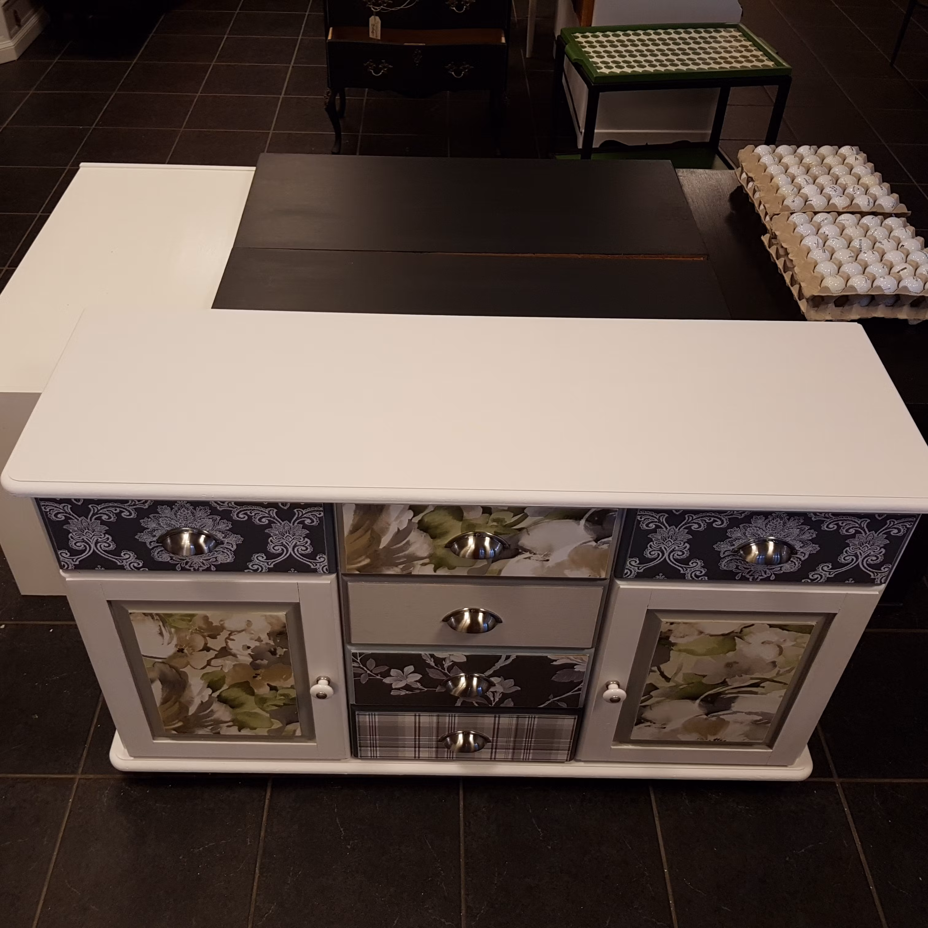 För kunds räkning har jag gett en skänk i furu nytt liv. Den är målad med kritfärg av märket #Autentico Versante i kulören Pebbels och lådor och luckor är målade i olika nyanser av grått och tapetserade med kundens egna tapetstumpar.????