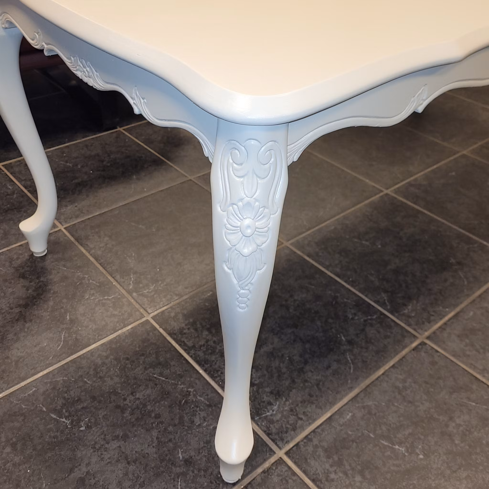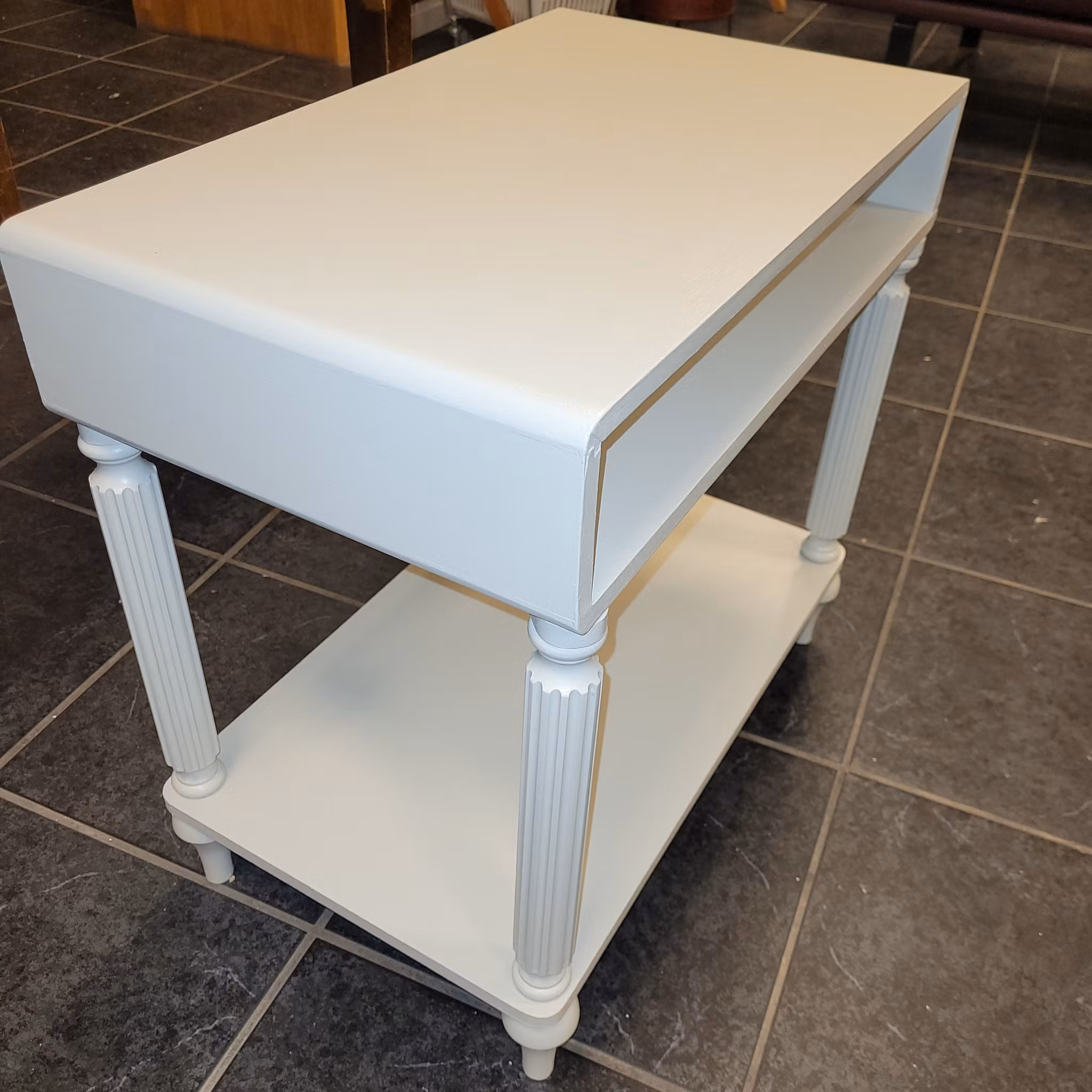 För kunds räkning har jag målat ett vackert soffbord och ett praktiskt avkastningsbord. Målat med kritfärg Autentico Versante Eggshell i kulören Almond.