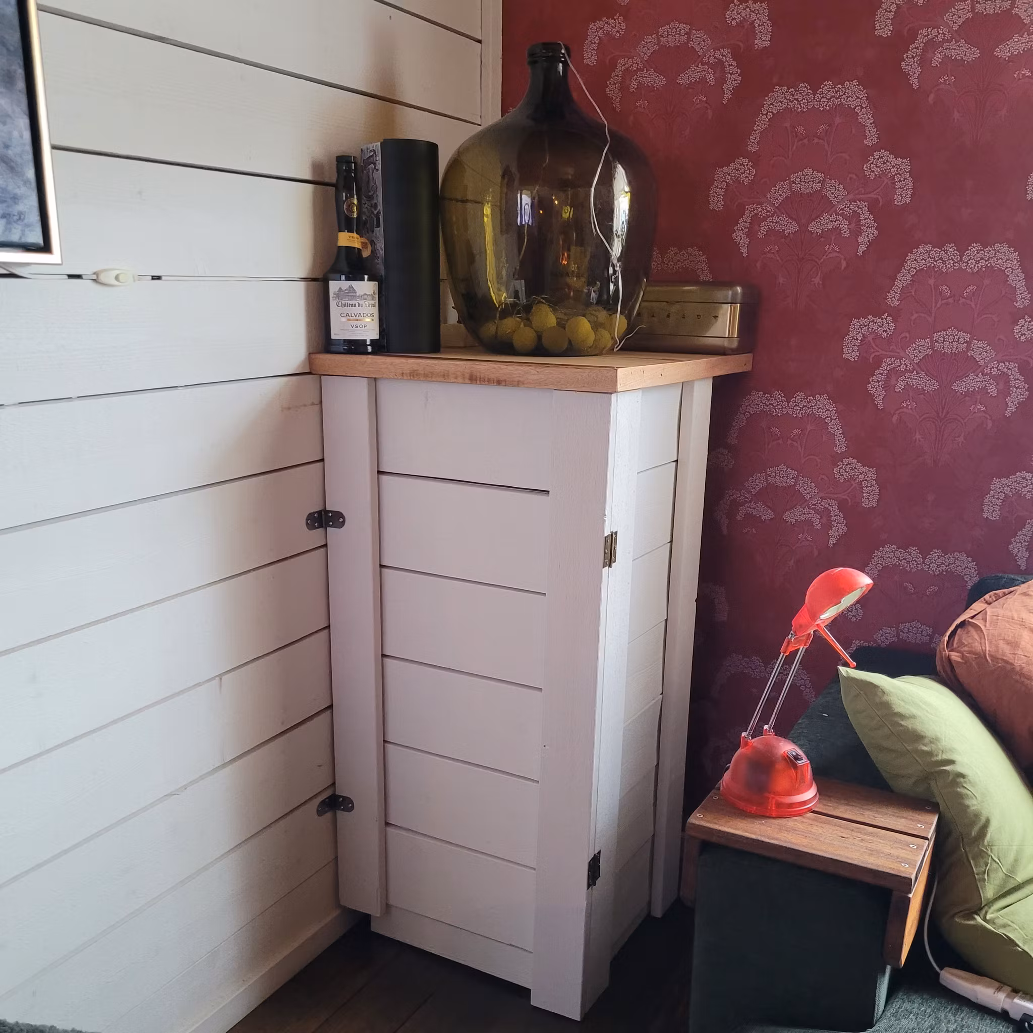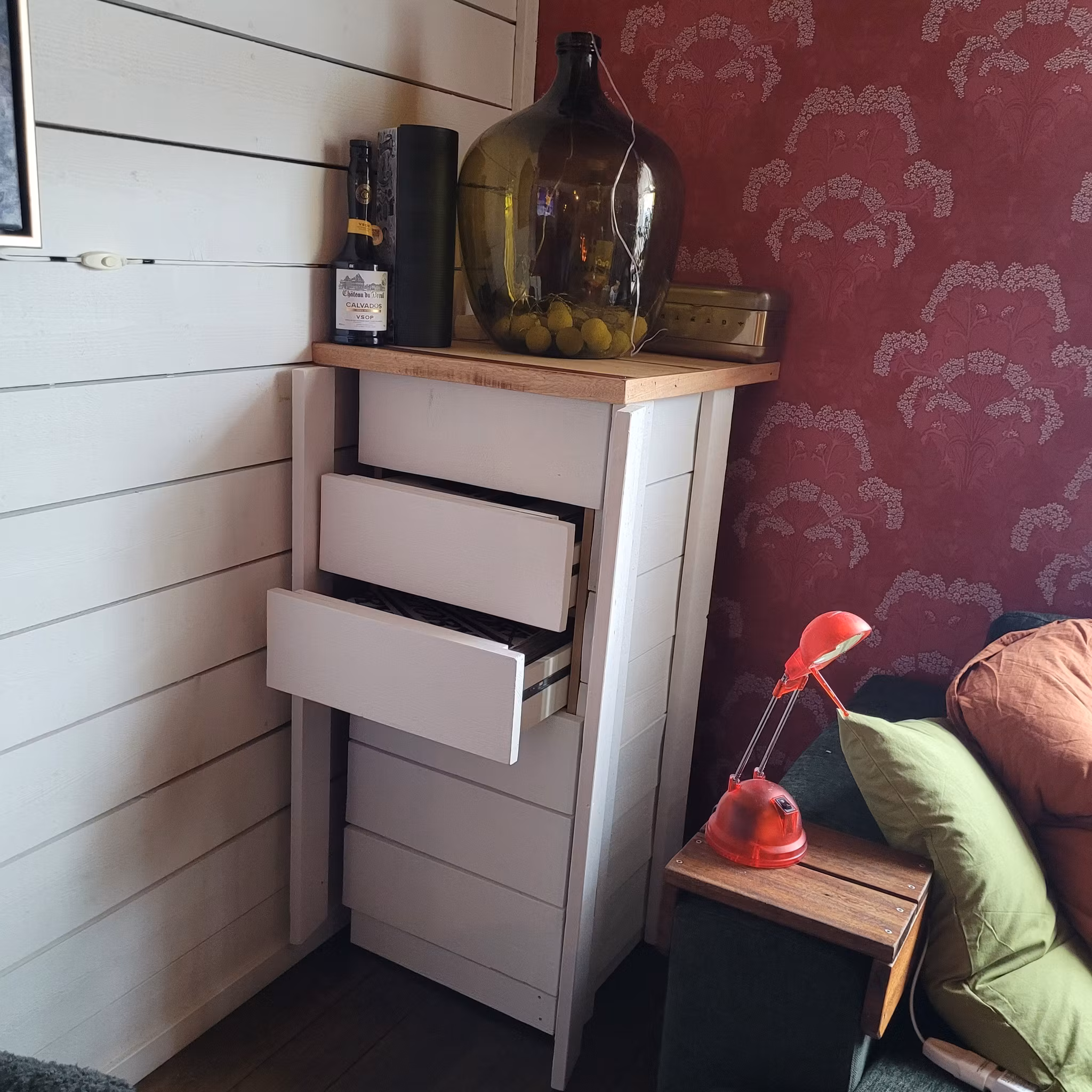 Vi behövde strukturera upp vår nya och gamla elektronik. Så det blev att bygga en ny TV-bänk med plats för vår gamla stereostapel och nyinköpta vinylspelare. Tv-ljud är nu integrerat med stereons högtalarsystem. Högtalare och förvaring av vinylskivor har jag dolt i specialbyggd förvaring.