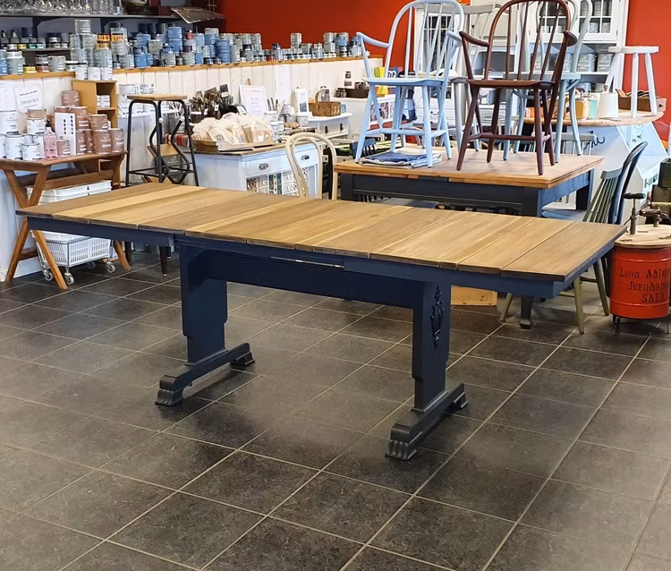 Bordet har vackra lejontassar och stommen är målad med kritfärg av märket Autentico Versante Matt i kulören Graphite. Bordsskivorna är tillverkade av gamla plank som spikrensats, hyvlats, slipats, betsats och behandlats med hårdvaxolja. Varje iläggsskiva är unik i sig.