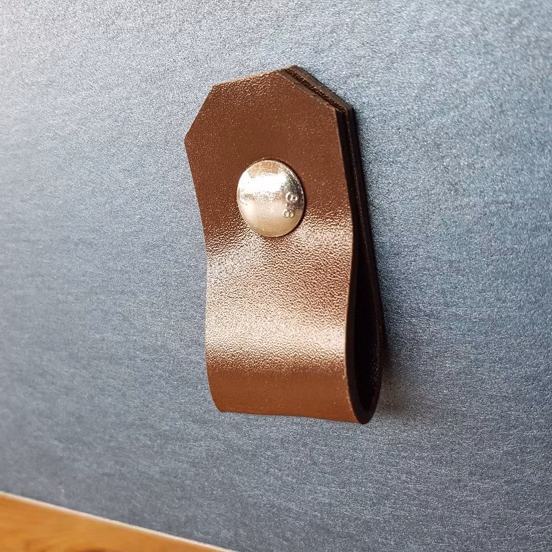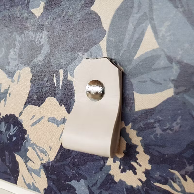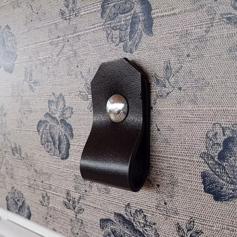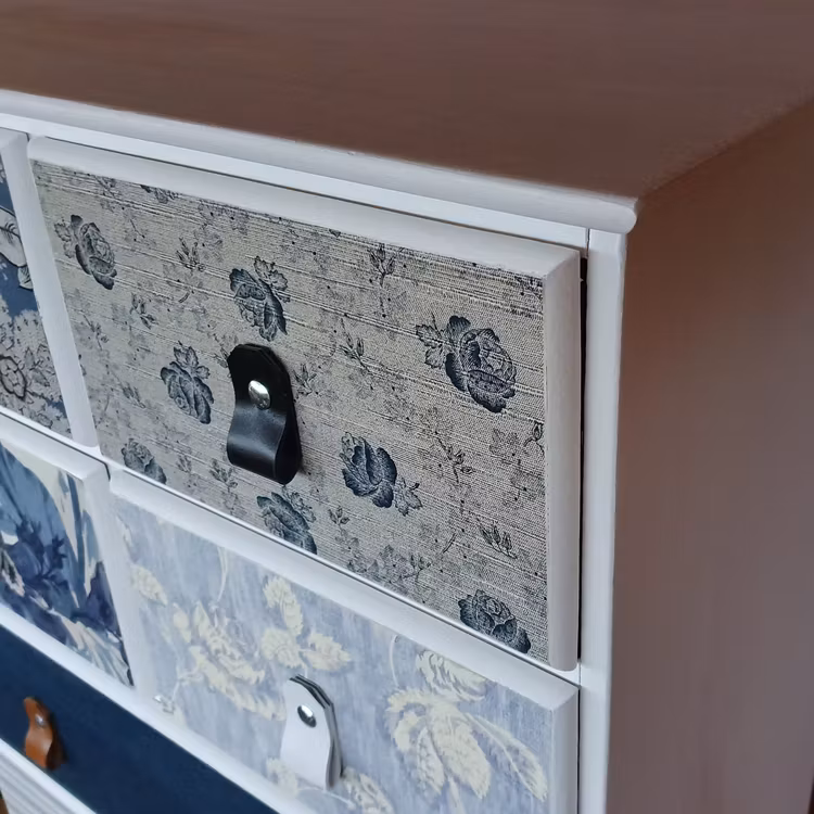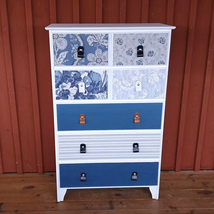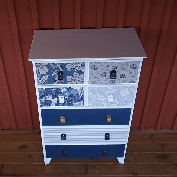 En ståtlig furubyrå som fått ett personligt och unikt utseende med tapeter i blått och egentillverkade läderbeslag. Målad med kvalitetsfärg #Autentico Versant Matt i kulören Ice Cream.