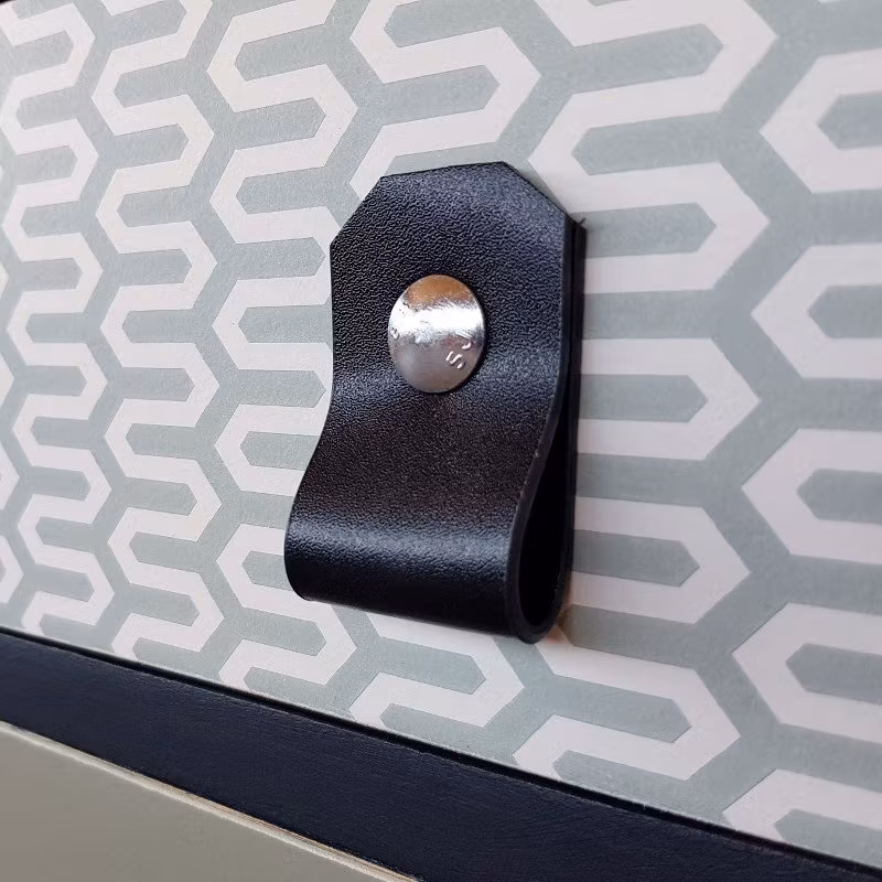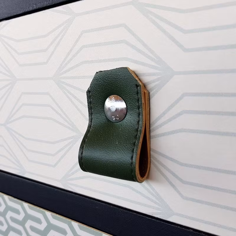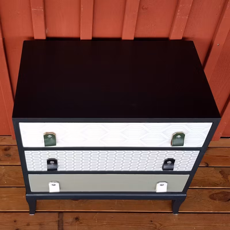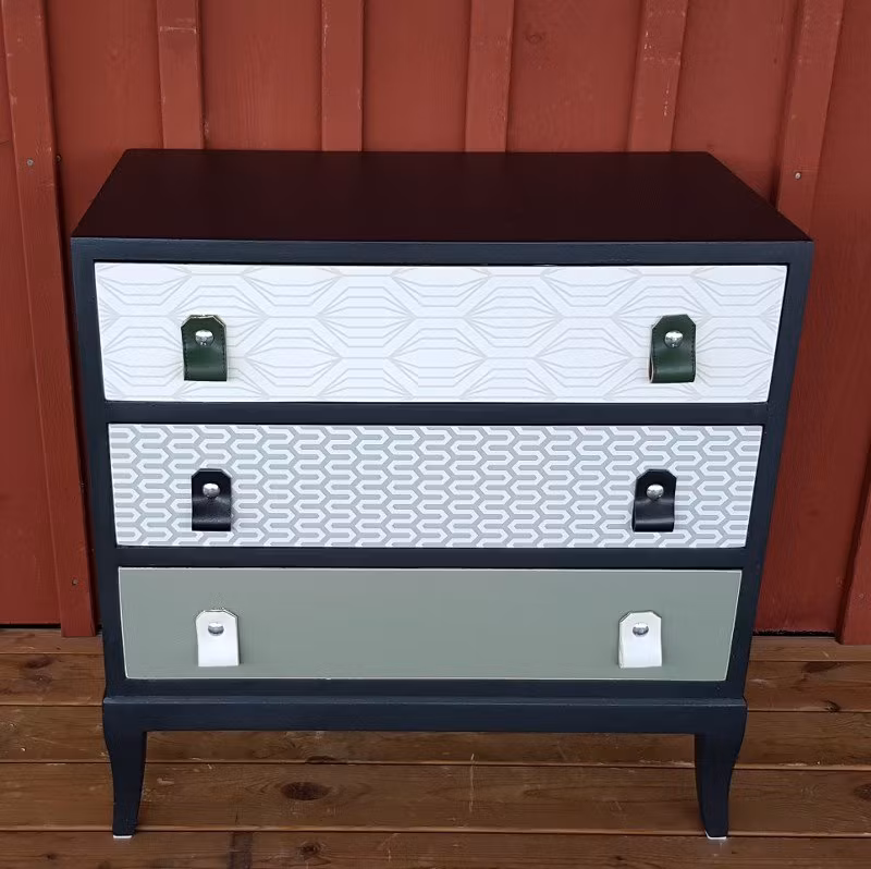 Praktisk byrå i personlig design. Lådor tapetserade med tapet och egentillverkade handtag.