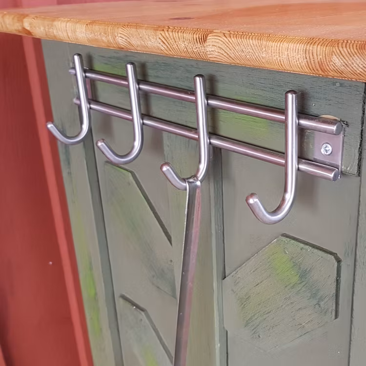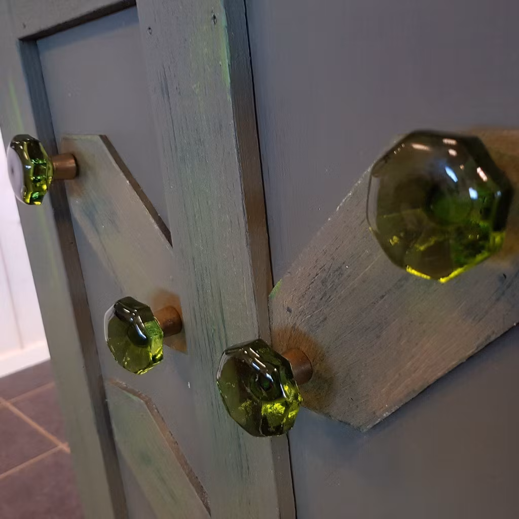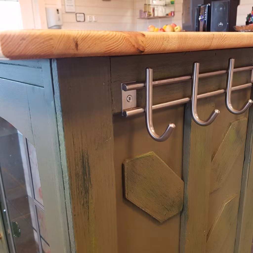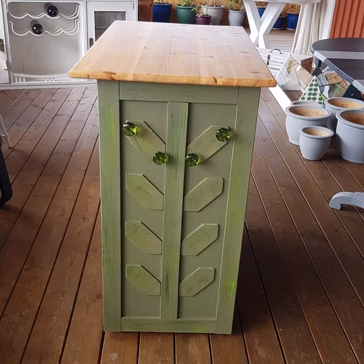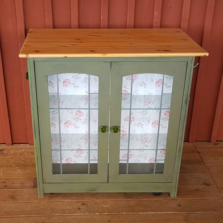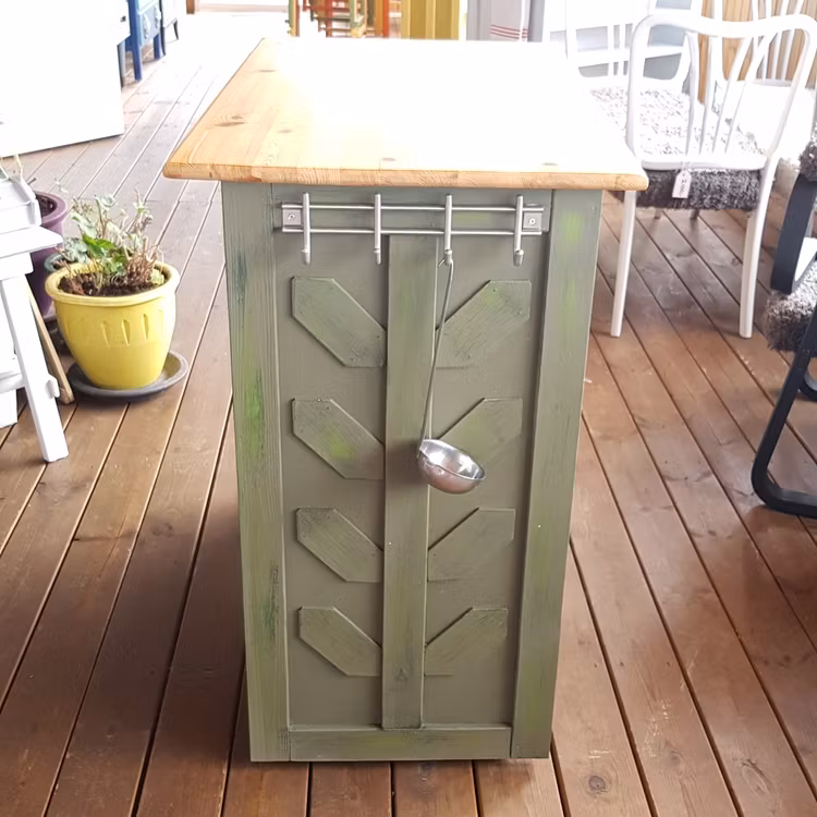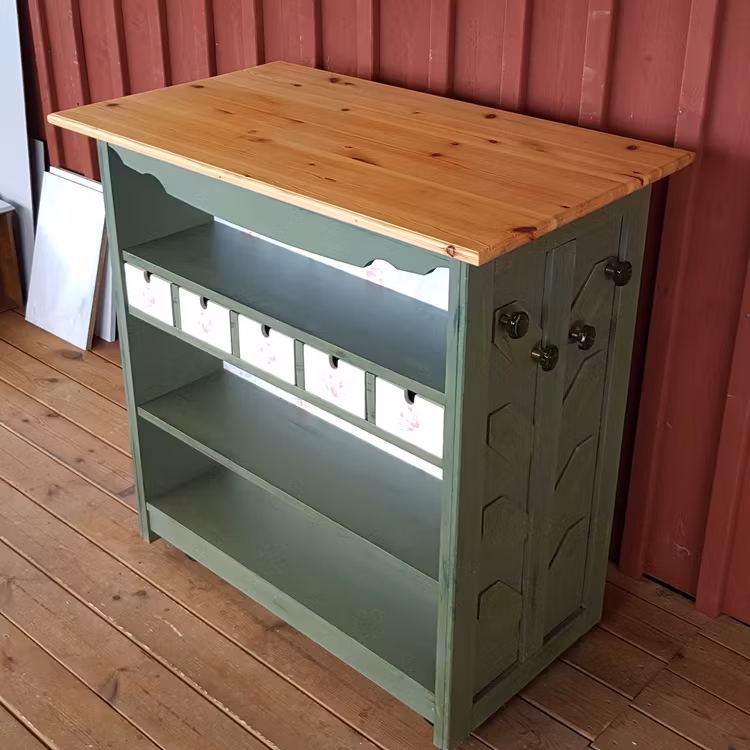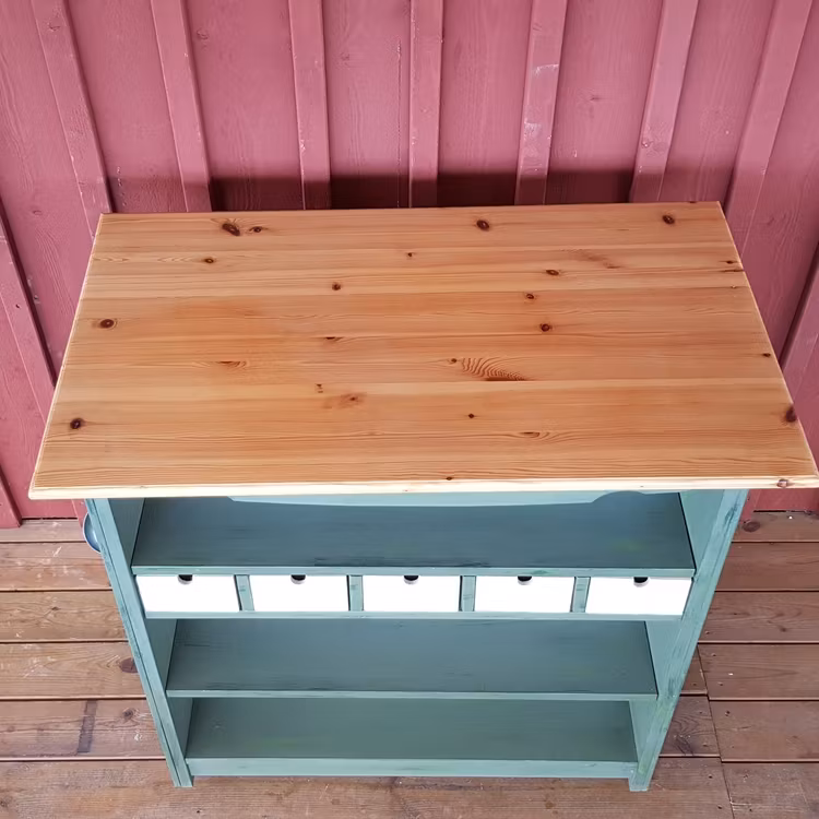 En unik och högst personlig och praktisk köksö som man blir glad av. Utrustad med hjul och fyller sin funktion för avlastning i såväl köket som på altanen. Tillverkad av överskåp från en fd. oälskad 90-talsbokhylla som var ämnad för tippen. Målad i tre nyanser av härlig grön kritfärg av märket Autentico i kulörerna Wilderness, Black Hills och Green Tea. Bänkskivan är hårdvaxolje-behandlad och kommer från ett soffbord och fondtapet kommer från Colorama, Motala